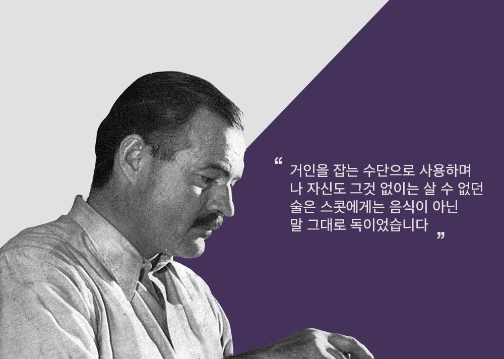 헤밍웨이에게 술은 기쁨이었다. 하지만 헤밍웨이에게 술은 작업에 영감을 주기보다는 지친 일상을 달래주는 충전제였다. 하루 종일 머리를 쓰고 열심히 일을 하고 난 뒤에, 내일 또 일을 해야 할 것을 생각하면 스트레스나 압박이 크다고. 그때 기분을 환기시켜주는 존재가 바로 술이었다. 작품을 쓸 때는 술을 입에 대지 않았다.