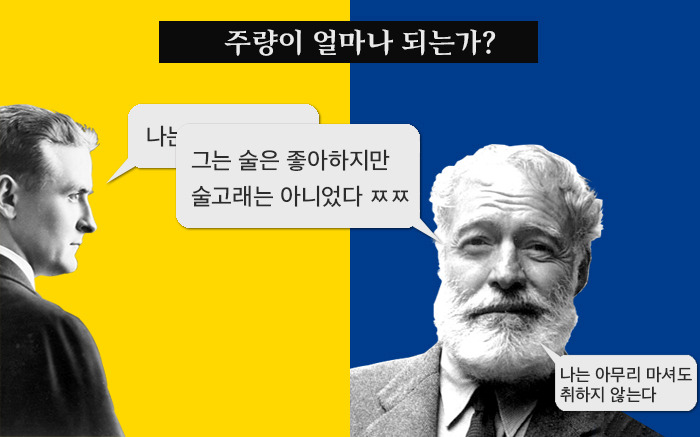 반면 헤밍웨이의 알콜내성은 전설적이었다. 그는 술을 아무리 마셔도 취하지 않았고, 다음날 아침에 일찍 일어나 사람들을 놀라게 했다. 주당들 사이에서는 자랑이겠지만, 우리의 피츠제럴드를 만나면 상황이 달라진다.