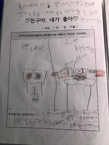 학교에서 가장 친한 친구에 대한 소개를 했나 보다. 활동지에 순위를 적어 집으로 가져왔다. 사람 친구는 단 한 명도 없었다. 활동지엔 곤충들이 순위 경쟁을 하고 있었다. 전부터 아이는 선언했다. 우리 집에서 가장 좋아하는 건 넓적이. 장수풍이, 왕돌이... 그리고 엄마는 4위, 아빠는 5위, 동생은 6위. 엄마도 곤충들에게 순위에서 밀렸다. 아이의 가장 친한 친구, 넓적이가 겨울잠을 깨 요새 한창 아이에게 기쁨을 주고 있다.