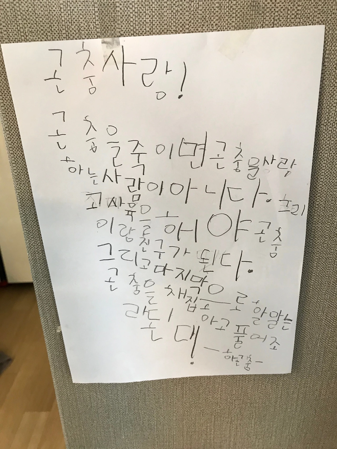 그런데 어느 일요일. 아이는 갑자기 뭔가를 쓰기 시작하더니 벽에 종이 한 장을 붙여놓았다. 평소 아이가 생각하는 곤충 철학이 집약된 글이었다. 거실에서 정글탐험대 놀이를 한다더니 이런 글을 쓴 것이다.