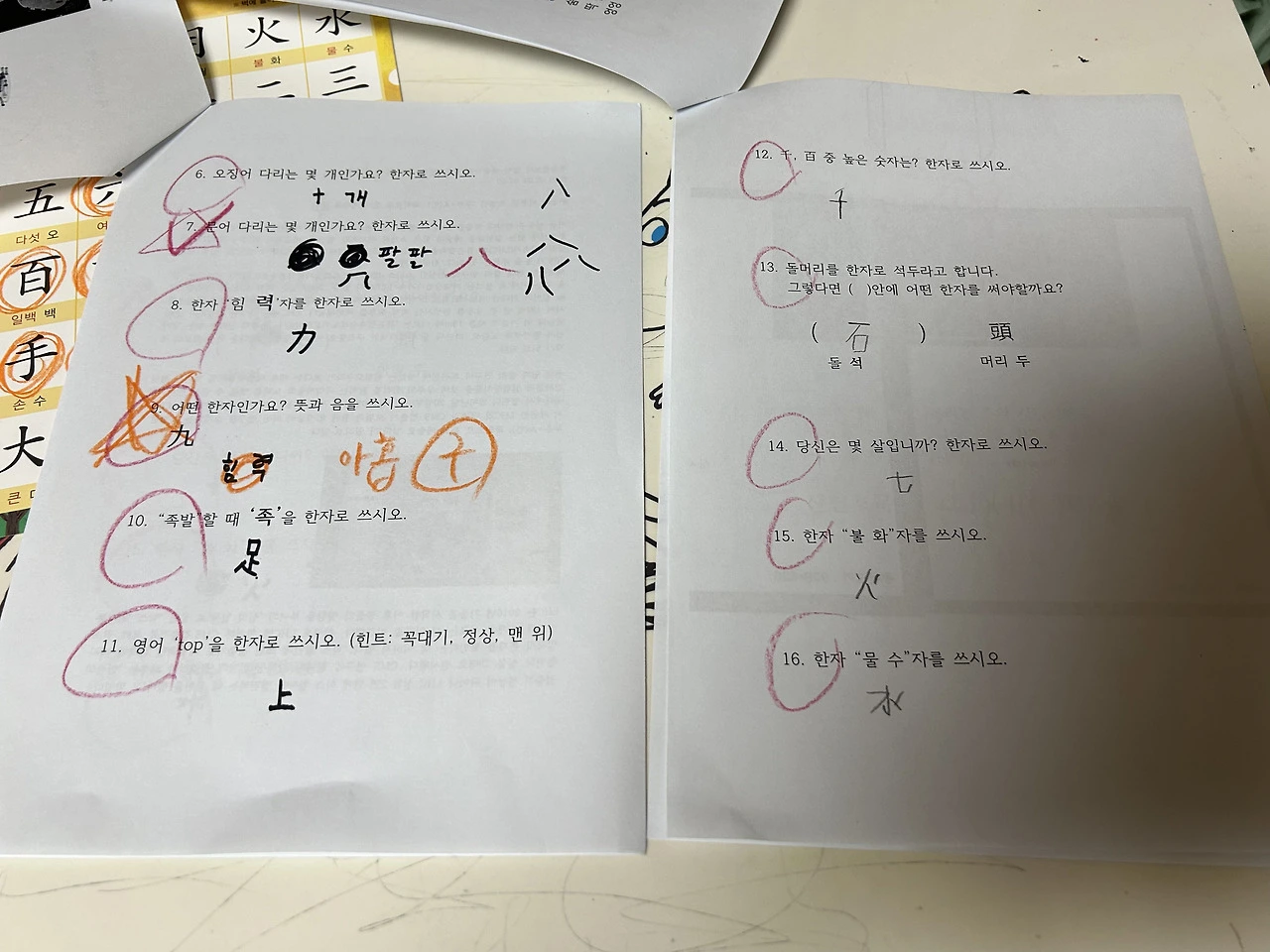 둘째에겐 무리였다. 직접 한자를 쓰게 한다는게 며칠했다고 가능하게 아니었다. 그래서 결국 둘째는 오픈북으로 시험을 치르기로 했다. 물론 첫째에겐 양해를 구했다. 대학교 중간 고사도 아니고 오픈북이라니...ㅋㅋㅋㅋ