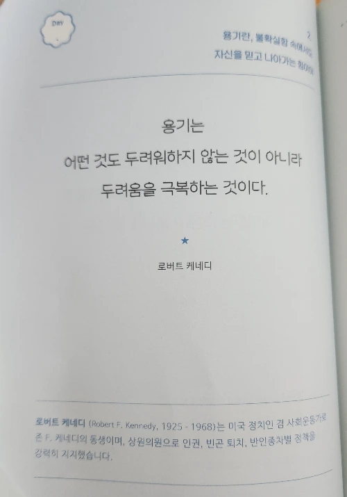 "용기는 어떤 것도 두려워하지 않는 것이 아니라 두려움을 극복하는 것이다."