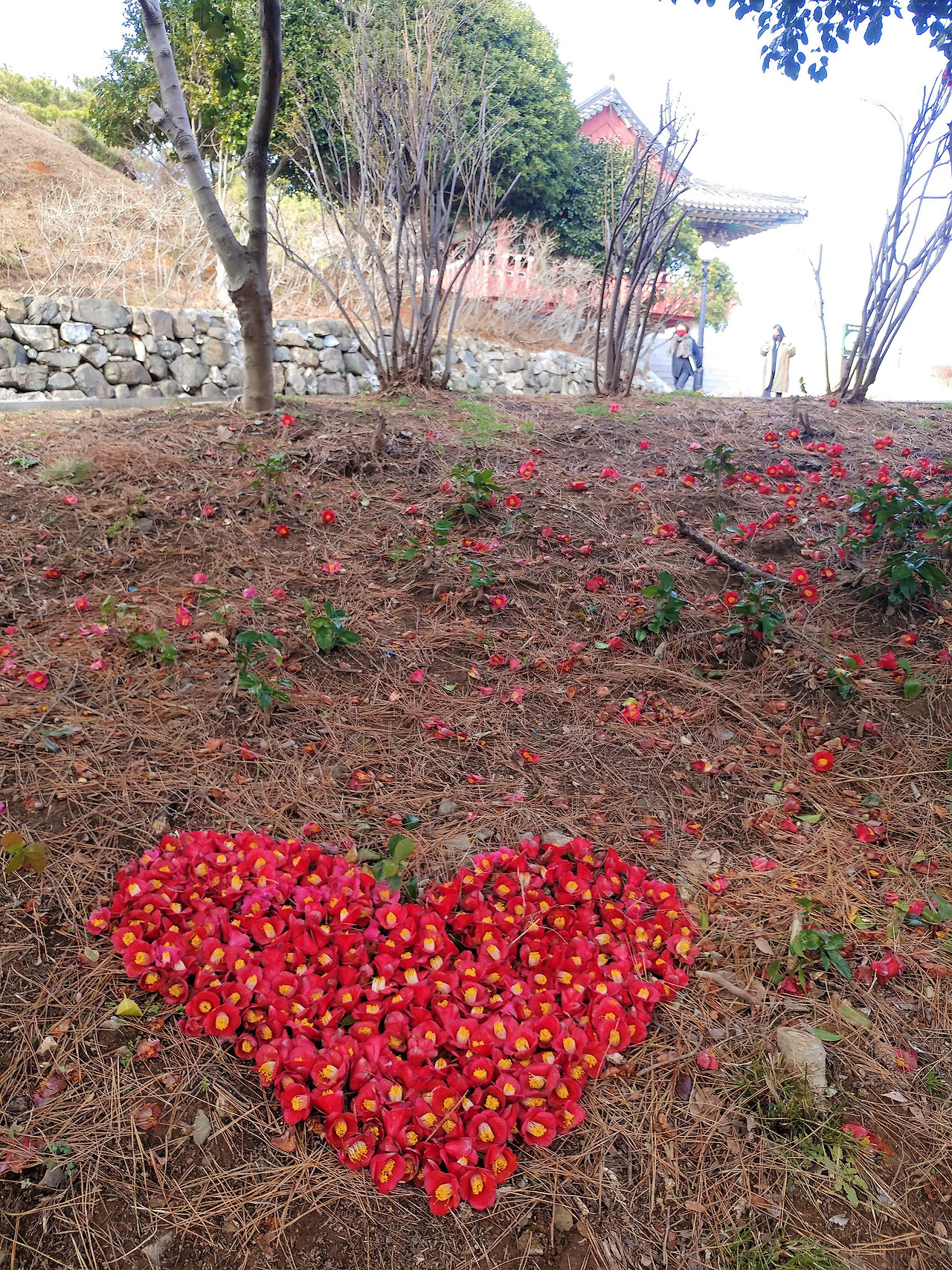 누가 만들어 놓았을까? 사람들의 길가에선 보이지 않는 비탈길에 심어 놓은 누군가의 빨간 마음 잠시 정원 위를 걸어보았다. 아스팔트 위를 걷는 것보다 편안한 땅의 촉감이 발 끝으로 전해지는 느낌이 좋았다. 이리저리 둘러 보는 길에 정원에 떨어진 동백꽃 잎을 모아 하트 모양으로 만들어 놓은 누군가의 정성이 눈에 들어왔다. 선혈처럼 빨간 꽃에 누가 저렇게 마음을 담았을까? 첫 사랑을 탐하고자 정성을 들인 소녀들의 바램이었을까? 이루지 못한 사랑을 추억하는 중년의 그리움이었을까! 고운 마음 눈으로 호강하며 가슴에 담았다.