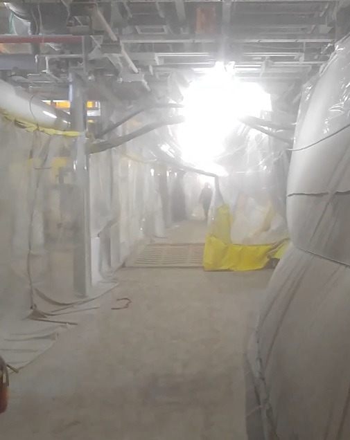 현장의 먼지는 유독가스 마스크를 써야 할 정도지만, 근처에 담배 피우는 휴식 공간이 있다.