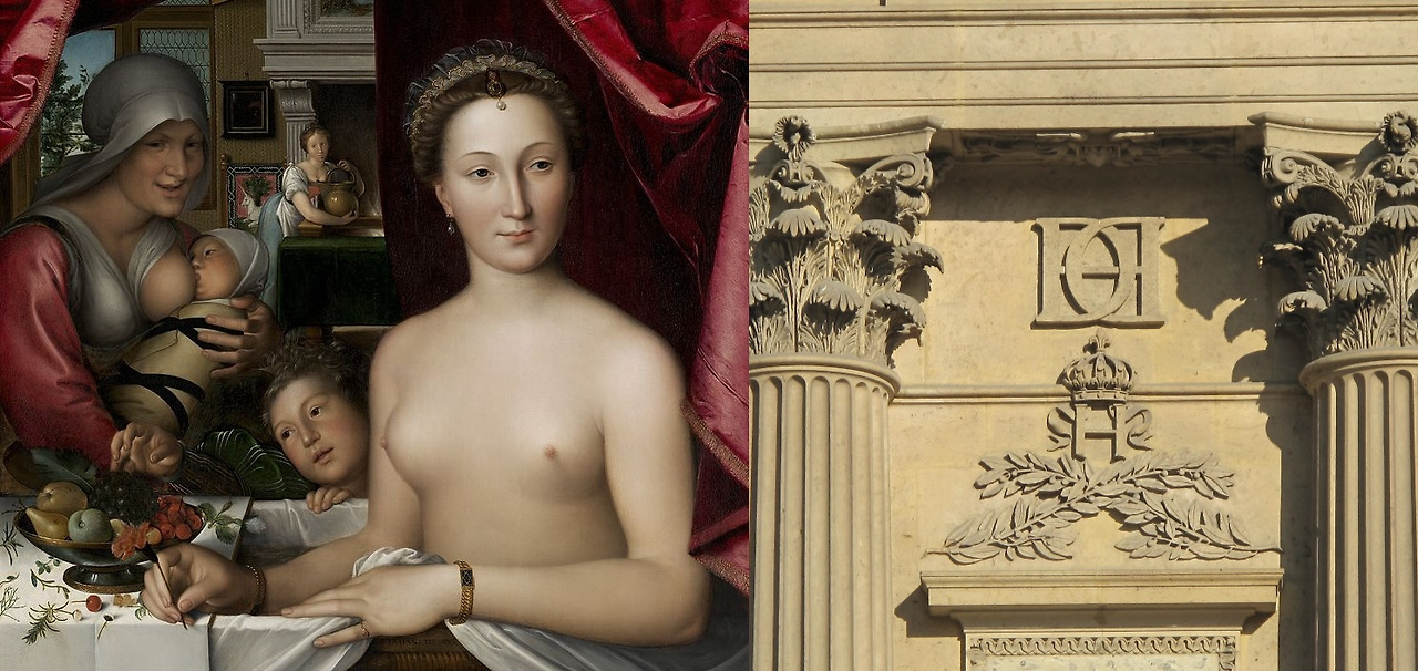 François Clouet 작품 Diane de Poitiers와 루브르 박물관 벽에 새겨진 앙리와 디안느의 상징