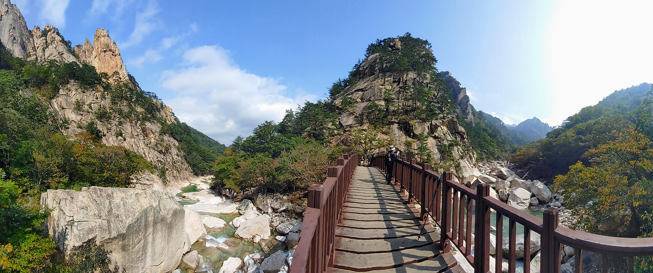 알록달록 단풍이 물든 나무를 앞에 두고 아직 온전하게 단풍이 들지 않았어도 햇빛에서도 느끼는 완연한 가을의 냄새가 단풍 색깔과 함께 한껏 오감을 자극했다. 은은한 햇살 저 멀리 우뚝 솟은 큰형제 봉우리 뒤로 거대한 능선이 버티고 서 있는 풍경에 그동안 알아왔던 설악산이 아니란 사실을 문득 깨달았다. 다리 위에서 양쪽을 번갈아 보다가 넓은 공간으로 이동해 배낭을 벗어놓고 장군과 적벽을 오르는 사람들을 바라보다가 스르르 잠이 들었다. 신선한 가을바람이 얼굴을 쓰다듬으며 온화한 햇살과 함께 벽을 기대고 앉은 내게 히프노스가 남몰래 스며들었다.