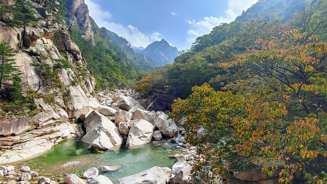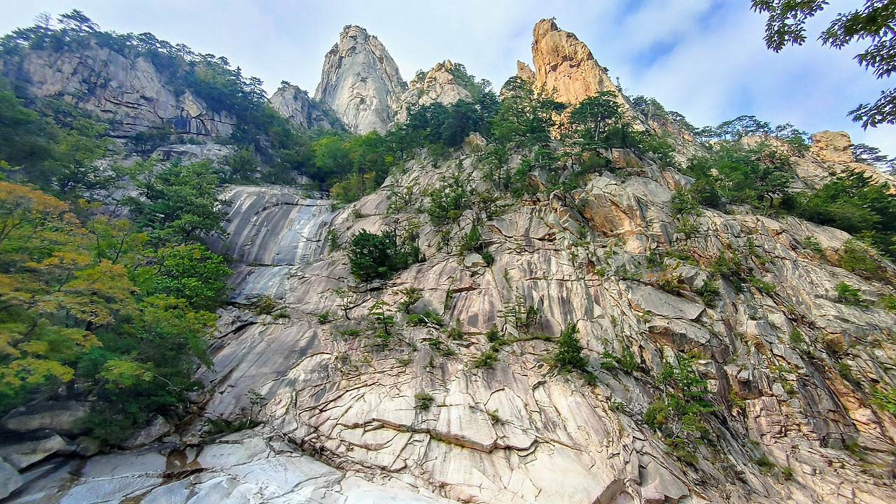 분주한 걸음이 지나고 나면 저 높은 곳에서 들려오는 고함소리와 함께 장비 소리가 마치 생명을 붙잡고 있기라도 한냥, 바위와 부딪히는 소리까지 청아하게 들리는 듯한 착각 속에 넋을 놓고 있다가 잠깐 눈길을 거두고 뒤의 계곡을 돌아보았다. 그리고 나도 모르게 입이 벌어졌다.