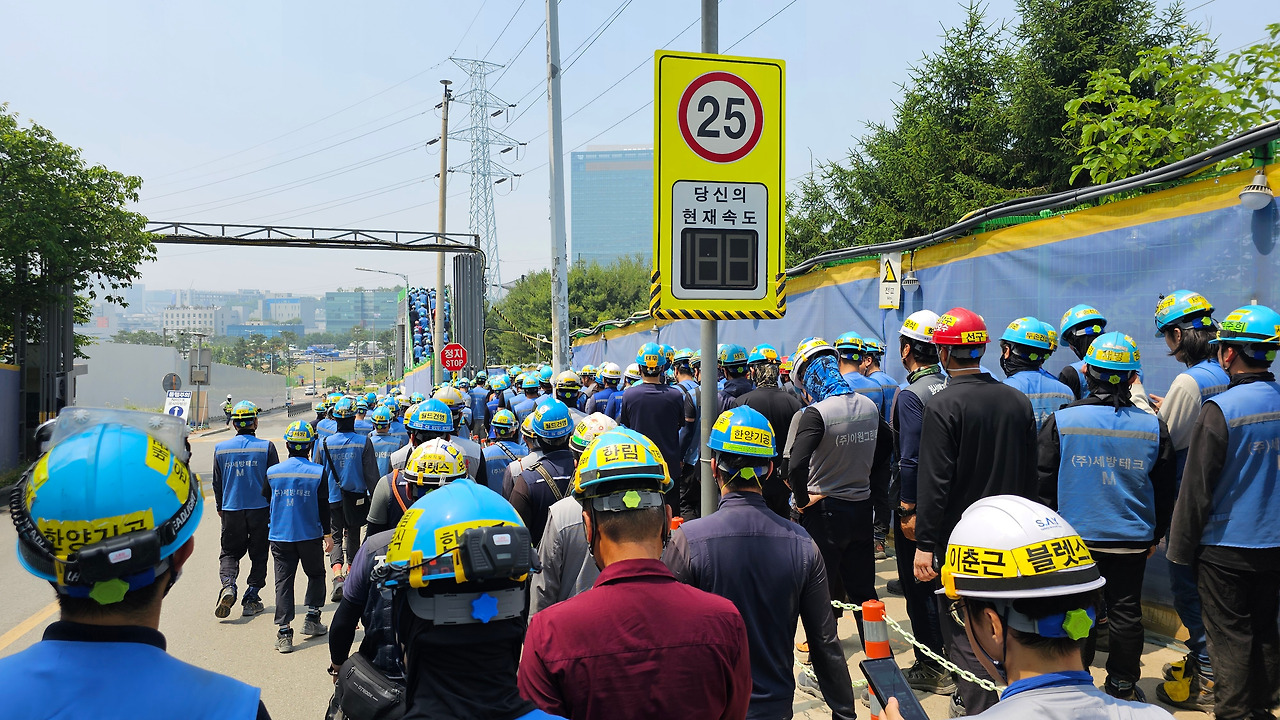 기흥삼성반도체 현장, 점심 먹으러 출구를 나가기 위해 몰려 있는 노동자들