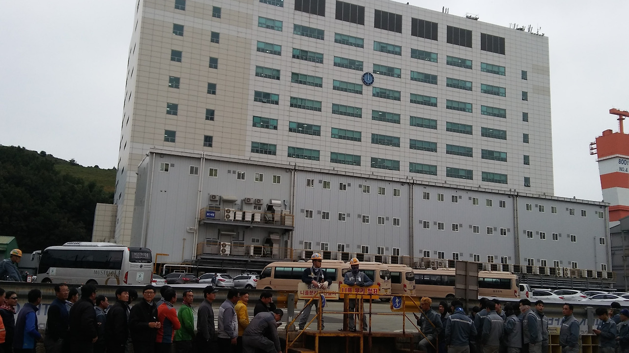쉬는 시간을 주지 않는 것이었다. 즉, 점심을 타이트하게 관리해서 배나 모듈에서 12시 이전에 내려오지 못하게 했다. 내려와서 혹시 식당으로 향하는 인력이 있다 하더라도 삼성 직원들이 나와서 막았다. 식당까지 가는 시간? 중요치 않았다. 현장에서 모듈이나 배 아래로 내려올 수 있는 시간이 12시였다. 그 이전에 못 나오게 삼성 직원들이 막았다. 협력업체 직원들은 협력업체가 관리해야 했음에도 삼성 직원들이 몸소 '시종 시간 엄수' 어깨띠를 두르고 배를 내려오는 길목을 지켰다.