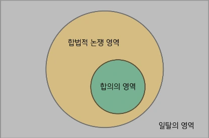 민주주의를 어떻게 바라볼지 결정했다면 그다음은 언론이 제공하는 정보를 구분하는 규범적 기준에 대해 알아보자. 언론학자 다니엘 할린(Daniel Hallin)에 의하면 미디어를 통해 노출되는 정보는 크게 합의의 영역, 합법적 논쟁 영역, 그리고 일탈의 영역에 포함된다. [2] 이 모델은 생각하는 개인인 우리에게 미디어의 표현을 구분하는 기준을 제공한다.