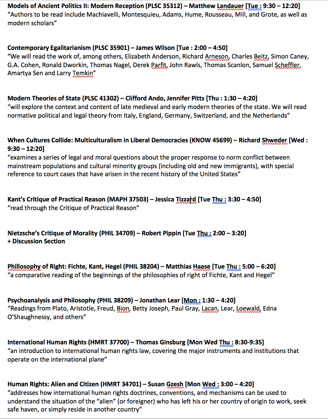 첫 학기를 프로그램 코어 수업과 프로그램 전공 수업을 들어서 이제는 정말 석사 프로그램을 벗어나 과에서 제공되는 정식 대학원 수업들을 듣고 싶었다. 그래서 이 과 저 과 홈페이지 들어가서 찾아본 결과 생각보다 듣고 싶은 수업들이 많았다. 정리해보니 10개... Models II를 듣기로 결정한 이상 남은 9개 중에 2개만 고를 수 있는 상황이었다. 수업은 한 학기에 무조건 3개만 들을 수 있고 사실 3개도 많이 벅차다. 관심이 가는 순서대로 나열해 보고 나서야 어느 정도 답이 나왔다. 평소에 평등, 분배 등에 관심이 많았으니 이에 관한 수업이 당연 1순위. 그리고 성적 받기 너무 힘들 것 같은 철학 수업이나 이미 한국 대학원에서 배웠던 인권, 다문화 수업들은 쉽게 포기가 되었다. 그래서 남은 건 Modern Theories of State. 이건 요즘 정치사상 쪽에서 아주 유명한 Jennifer Pitts라는 교수가 가르치는 수업이라 특히 관심이 갔다. 역사학과 교수인 Ando와 함께 가르친다는 것도 새로운 형식의 수업이라 관심이 갔다.