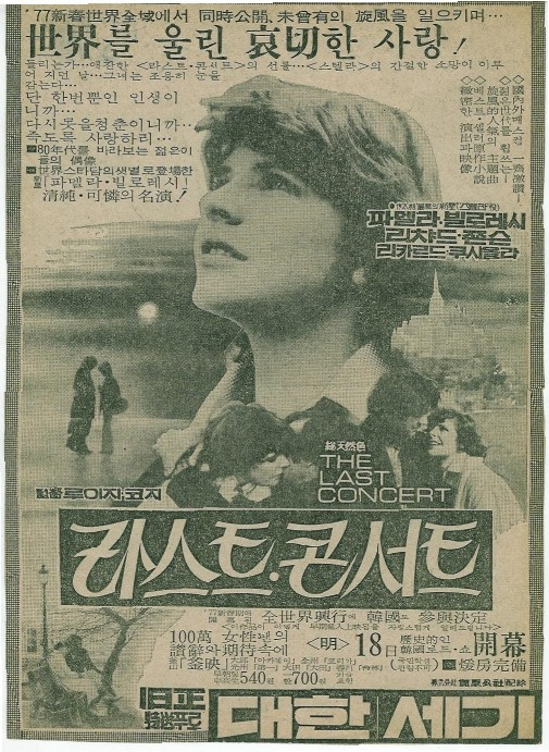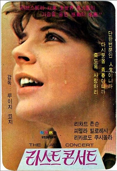 일반적으로 영화팬들이 가슴 아픈 로맨스 영화의 대표작이라고 하면 1970년작 러브스토리와 1968년작 로미오와 줄리엣을 떠올리곤 한다. 하지만 이 두 영화 못지않게 관객들의 심금을 울리는 영화가 있었으니 그 영화가 바로 1976년작 라스트 콘서트이다. 이탈리아 제목으로는 <Dedicato A Una Stella>, 영어 제목으로는 <take all of me>인 이 영화는 영국 배우 리처드 존슨과 이탈리아의 여배우 파멜라 벨로루시가 함께 공연한 작품으로 국내 개봉 당시에 서울 관객 약 19만 8000여 명을 동원한 흥행작이다. 이런 이유로 어떤 사람들은 70년대 감동적인 로맨스 영화의 쌍두마차로 러브스토리와 라스트 콘서트를 꼽기도 한다. 이탈리아와 일본이 합작하고 프랑스를 배경으로 하고 있으며 주인공은 영국인과 이탈리아인이 맡은 영화 <라스트 콘서트>. 이 영화는 주로 우리나라와 일본에서 크게 흥행한 편이었는데 아마도 이런 불치병을 소재로 한 신파적인 멜로 영화가 당시 우리나라와 일본에 정서에 맞아서 그런 건 아니었나 생각이 든다. 특히 이 영화는 ost가 정말 일품인데 주제곡인 <Saint Michelle>(국내에서 2004년에 김태희,비 주연의 드라마 풀 하우스에서도 사용된 바 있다.), 라스트 씬에서 나온 <adagio concerto>는 각각의 장면과 절묘하게 어우러져 슬픔과 감동을 배가 시키는 역할을 한다. 필자도 이 영화를 보면서 정말 슬퍼하며 눈물을 흘렸는데 만약 이 추운 겨울에 영화가 주는 슬픔과 감동으로 가슴과 눈시울을 뜨겁게 적시고 싶은 영화팬이 있다면 주저하지 않고 이 영화를 추천하고 싶다.