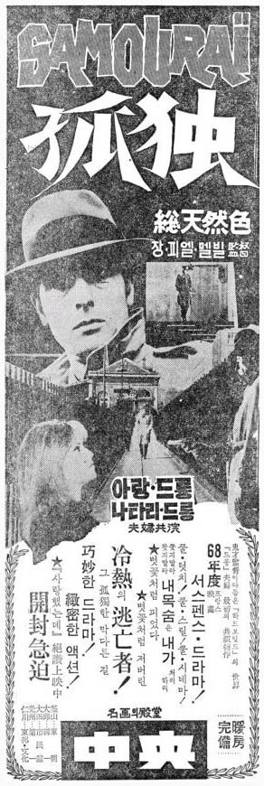 알랭 들롱의 영화를 많이 본 사람이라면 알 것이다. 트렌치코트, 중절모, 담배, 지독한 외로움에서 온 듯한 암울한 표정, 날카로운 눈매, 과묵함 등 알랭 들롱 전매특허 이미지. 그런 알랭 들롱의 고독한 이미지를 탄생시킨 영화가 바로 1967년에 개봉한 《사무라이》라는 영화이다. 국내에는 1968년 《고 독》이라는 영화로 개봉했고 조지 펠레그린이 쓴 소설 《낭인 The Ronin》을 원작이며 《태양은 가득히》, 《볼사리노》 시리즈와 더불어 그의 대표작이며 페르소나적 관계라 할 수 있는 쟝 피에르 멜빌과의 첫 만남이었고 그 결과는 실로 대성공이었다. 이 영화가 세상에 나온 후, 수많은 배우와 감독이 이 영화를 오마쥬 했으며 그 대표작 중 하나로 오우삼 감독 주윤발 주연의 홍콩영화《첩혈쌍웅》을 들 수 있다. 사무라이에서 킬러와 피아니스트의 관계가 영화의 포인트였다면 첩혈쌍웅에서는 킬러와 클럽 가수가 영화의 줄거리를 이끌어 나간다.