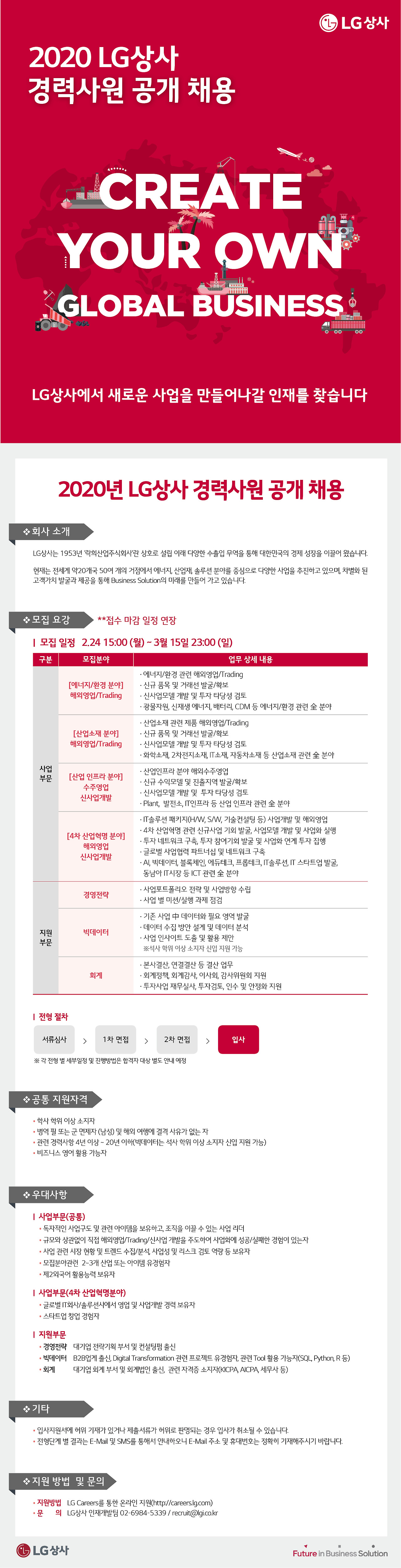LG상사는 종합상사의 새로운 길을 개척해나가고 있습니다. 기존에 가지 않았던 길이라 두려움도 있지만, 이 변화의 과정을 즐길 수 있는 분들과 함께 하고 싶습니다. “Future in Business Solution”, LG상사의 비전처럼 비즈니스 솔루션의 새로운 미래를 만들어가실 분들을 기다리고 있습니다.