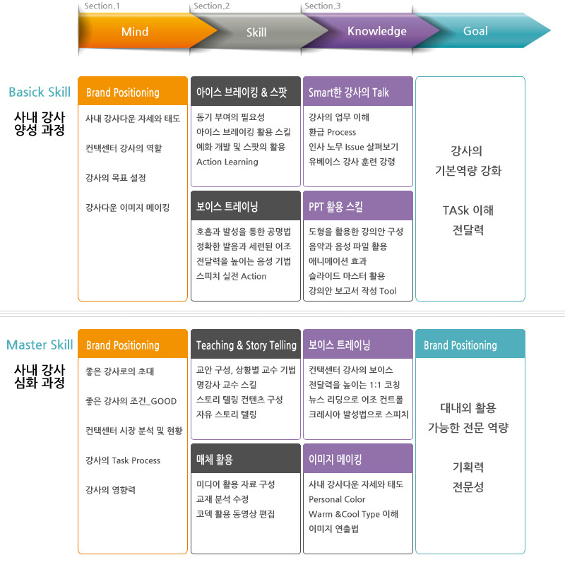 필요에 따라 기본/심화과정을 구분하는 경우도 많으며, 가장 핵심적으로 가르치는 내용은 보통 강의 스킬입니다. 대부분 사내강사들은 내용전문가이기 때문에 강의 스킬은 부족한 경우가 많기 때문이죠. 그래서 PT스킬교육을 살짝만 바꾸면 사내강사 양성과정으로도 활용할 수 있습니다. 강의 스킬은 교육 효과를 높이는 데 매우 중요한 요소이기 때문에 강의에 투입하기 전 반드시 실시하는 것이 좋습니다.