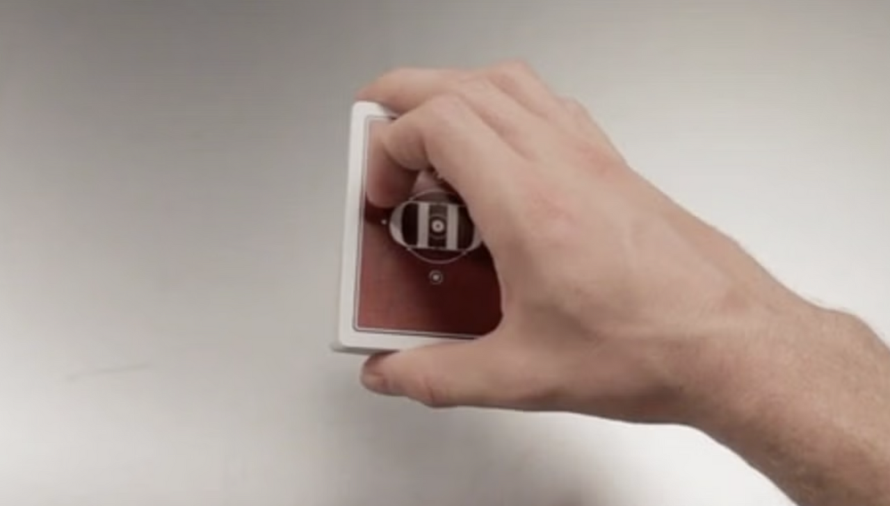 관객이 기억한 카드를 카드덱 사이에 넣고 섞은 뒤, 마술사는 손가락을 튕겨서 신호를 보냅니다.