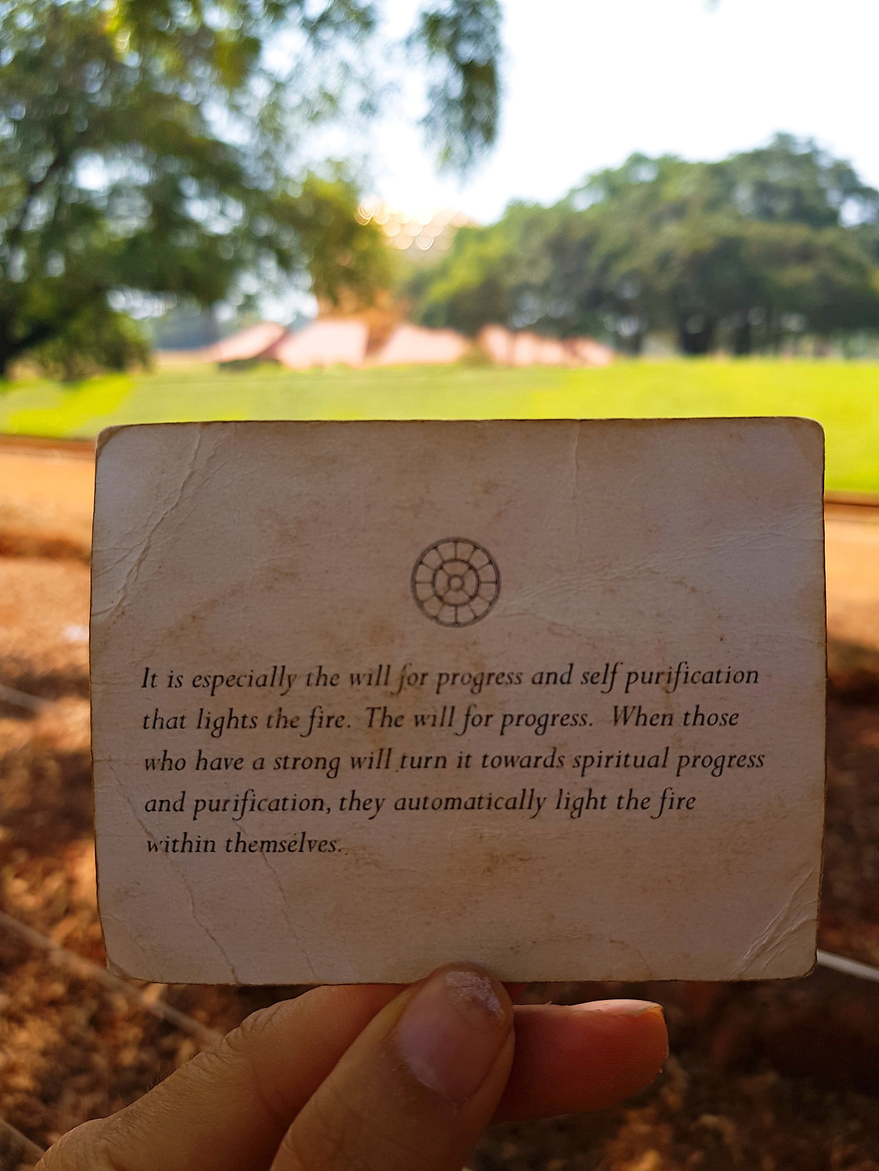 오로빌에 온 이후 매일 아침마다 명상실을 찾고 있다. 오로빌의 중심에 자리잡고 있는 황금구체, 마트리만디르는 이 구체를 떠받치는 연꽃잎을 형상화한 12개의 작은 명상실로 둘러싸여 있다. 이 작은 명상실은 각각 12개의 단어를 품고 있는데 명상자는 하루에 하나의 명상실을 선택해서 들어갈 수 있다. 나는 매일 그날 집중하고 싶은 주제로 명상실을 선택하고 있다. 오늘 내가 선택한 단어는 Progress.