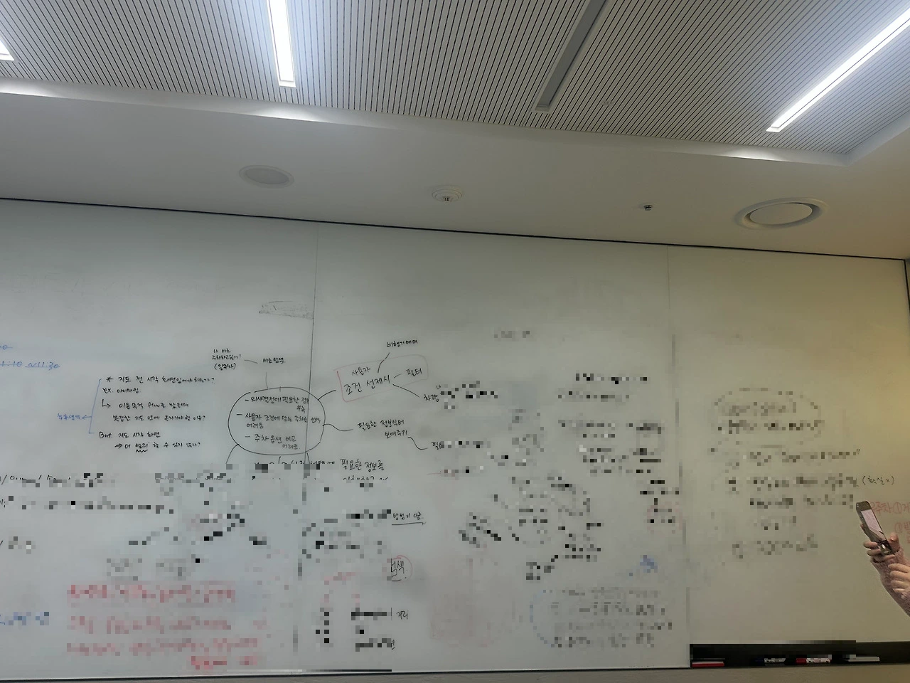 각자 작성 후 취합하는 것보다 다같이 의견을 자유롭게 나누면서 공유하는 방향이 좋다고 생각해서 칠판에 마인드맵 형태로 판서를 해가며 진행했다.
