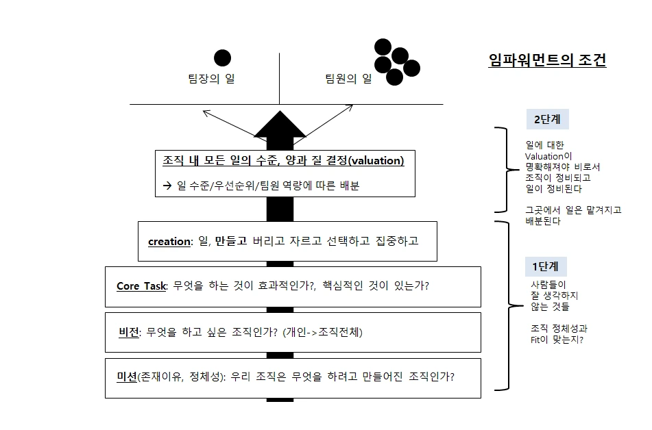 "일을 적절히 배분하고 권한을 잘 위임하는 방법"이 아니다. 임파워먼트가 잘 안 되는 대부분의 사람들은 중요한 것을 놓치고 있다. 그것은 먼저, 우리 조직의 정체성을 만드는 것이다. 그다음 그에 맞는 일을 디자인(설계)하는 것이다(직무설계 및 개발). 그리고 마땅히 팀장이 해서 좋을 일들과 팀원들, 각 담당이 해서 성과가 나올 일들을 벨류에이션 하여 배분하는 것이다.