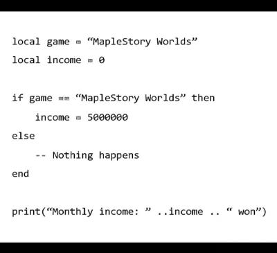 구문을 해석해보면 "만약 게임이 MapleStory Worlds라면 500만 원의 수입이 생기고, 그렇지 않다면 수입이 0원이다." 정도로 해석해 볼 수 있겠습니다.