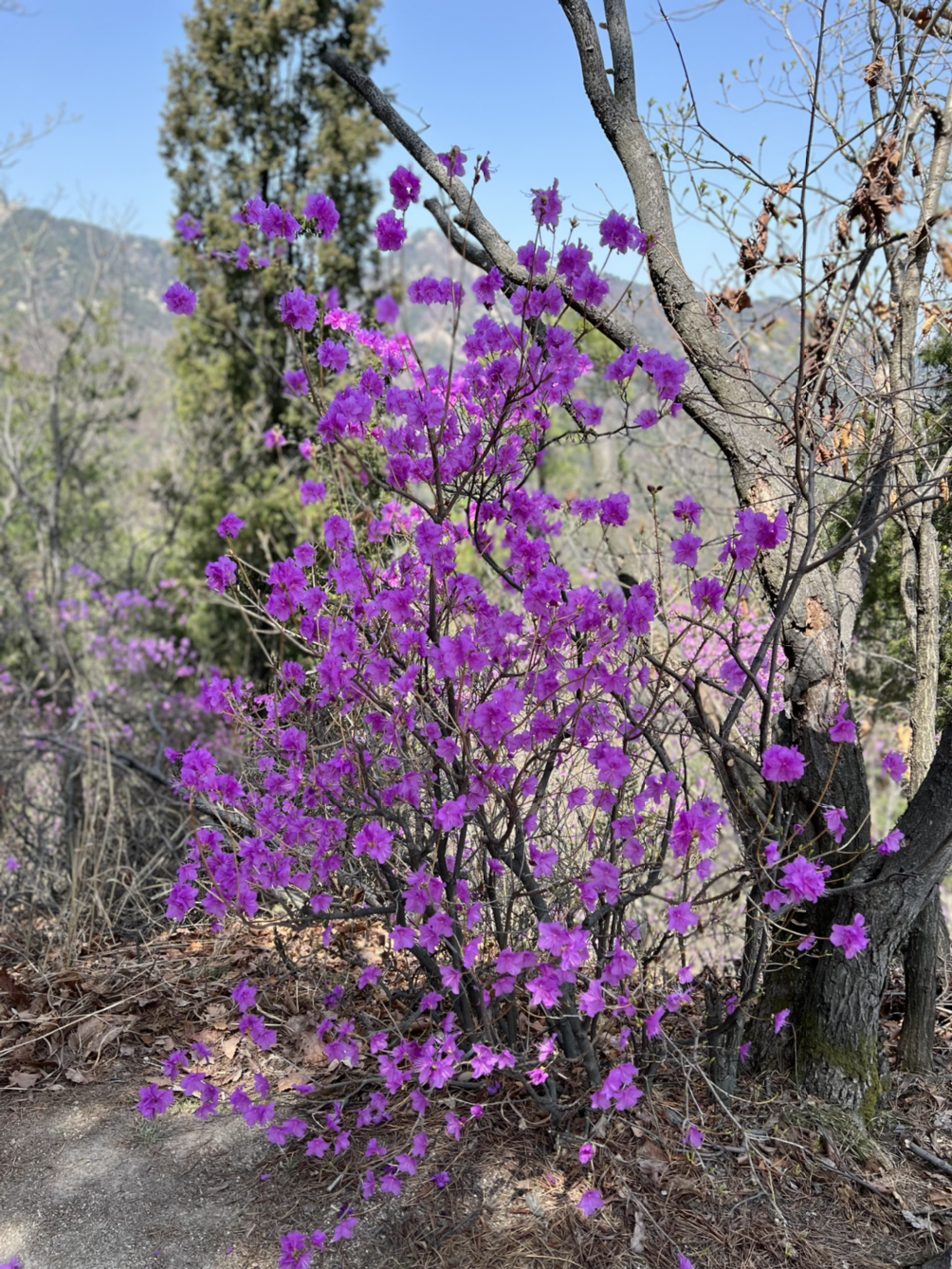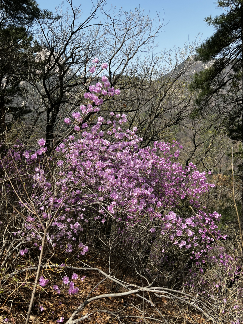 능선 길에 이르자 등산로 양쪽으로 진달래꽃이 우리를 반겼다. 등산로 아래쪽으로도 연분홍 진달래가 언뜻 거리는 것이 한복 입은 새 각시가 양팔로 치마를 살짝 들 때 보이는 뽀얀 발목을 훔쳐보는 것 같다. 눈에 비친 색감을 핸드폰으로 담으려 했지만 산 아래 핀 꽃까지 담지 못한다. 스마트폰 화질이 뛰어나다 하더라도 인간의 망막 앞에서는 새 발의 피다.