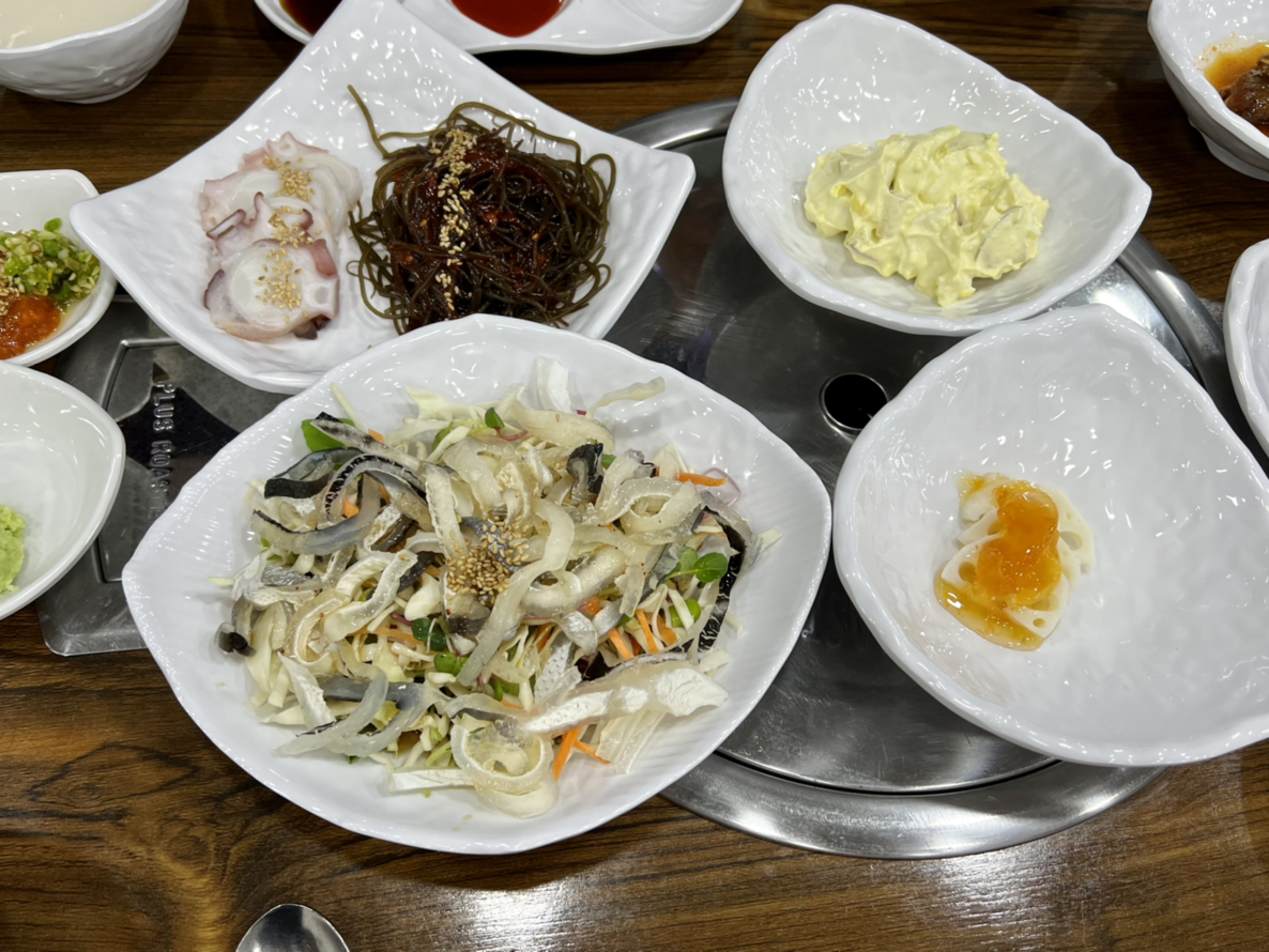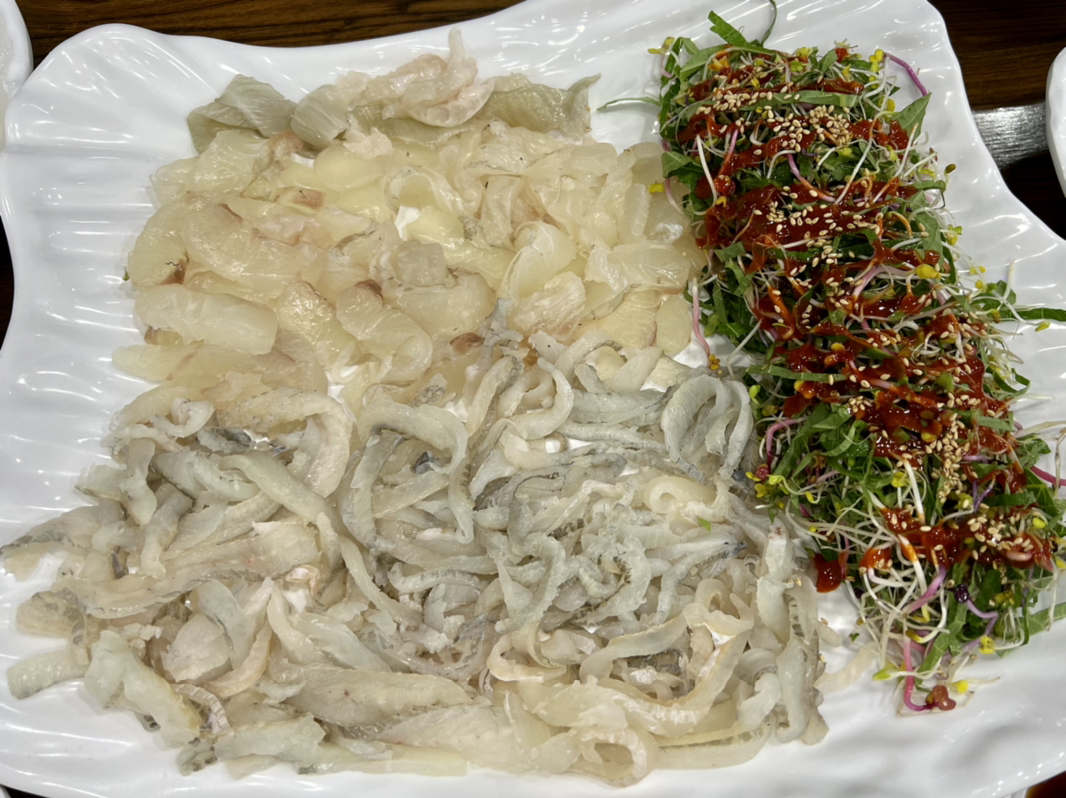 세꼬시는 김에 야채랑 싸 먹는 방식인데 처음 접하였다. 야채를 채 썰어 그릇 한쪽에 가지런히 올렸다. 입속에서 세꼬시가 오독오독 씹히는 식감 끝에 감칠맛이 느껴진다. 막걸리 꽤나 비우겠다.