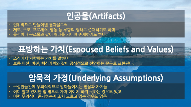에드거 샤인은 조직문화를 만들어내고 나타내는 요소로 3가지의 개념을 제시한다. 구성원들의 무의식에 존재하면서 그들이 알아차리지 못하는 사이 조직 내의 공기와 같이 떠다니며 그들의 생각과 행동에 영향을 미치는 '암묵적 가정(Underlying Assumptions)', 그리고 조직이 명시적으로 지향하고 나아가고자 하는 선언문인 '표방하는 가치(Espoused Beliefs and Values)', 마지막으로 이런 가정과 가치를 담아 만들어낸 인공물(Artifacts)'이 바로 그 3가지 개념이다.