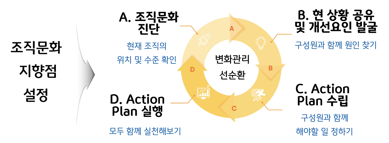 이렇게 조직이 나아가야 할 방향, 즉 조직문화 지향점을 수립했다면, 이후에는 아래와 같은 변화 관리 선순환 사이클을 만드는 노력을 해야 한다.