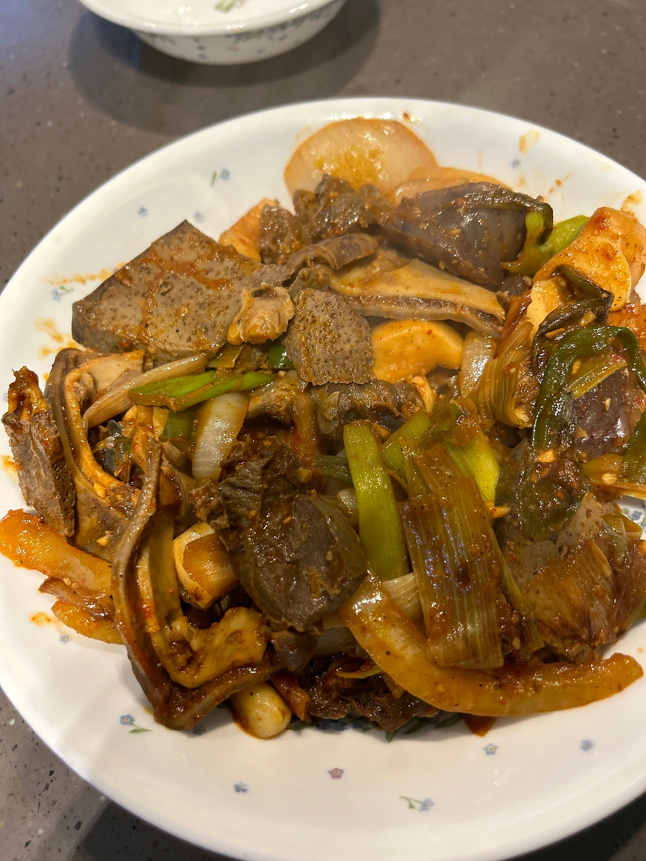 어제 남편이 시장에서 5천원어치 사온 순대가 많이 남았었다. 주로 내장이 많지만 하여간 그걸 다 순대볶음으로 만든다. 집에있는 야채를 많이 쓴다. 들깨가룬 없다. 점심으로 후딱 먹는다.