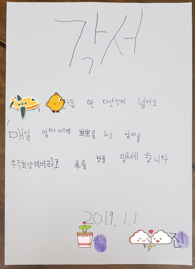 작년 1월 1일에 아들들에게 지장까지 찍어가며 각서를 받아두었건만 아직 올해가 다 가지도 않았는데 첫째는 벌써부터 저 각서가 어색하고 뻘쭘하다. 그래서 원하는 것이 있을 때만, 아주 기분이 좋을 때만, 선심 쓰듯 우주 최강 미녀라고 시크하게 던져준다.