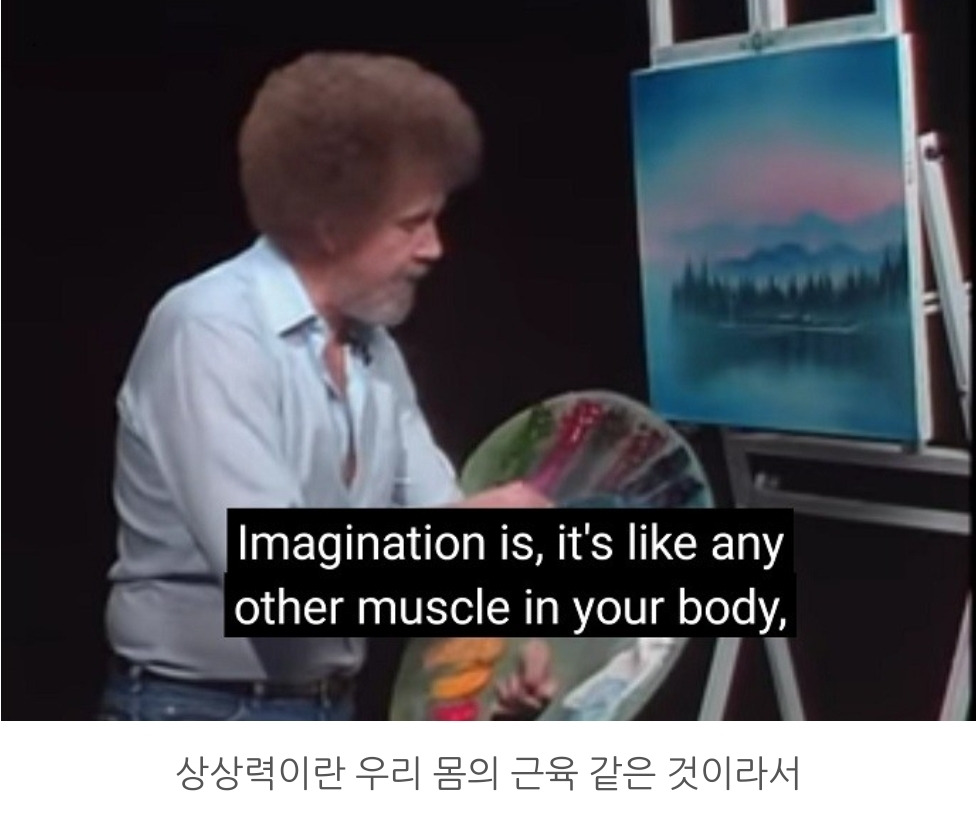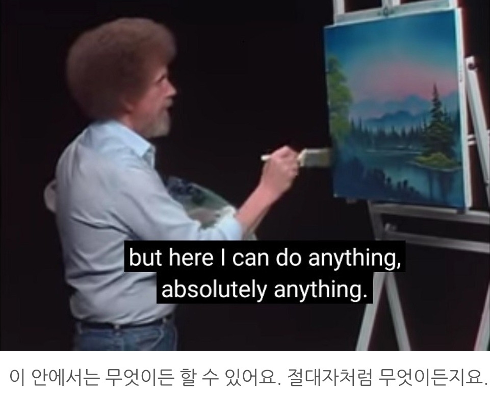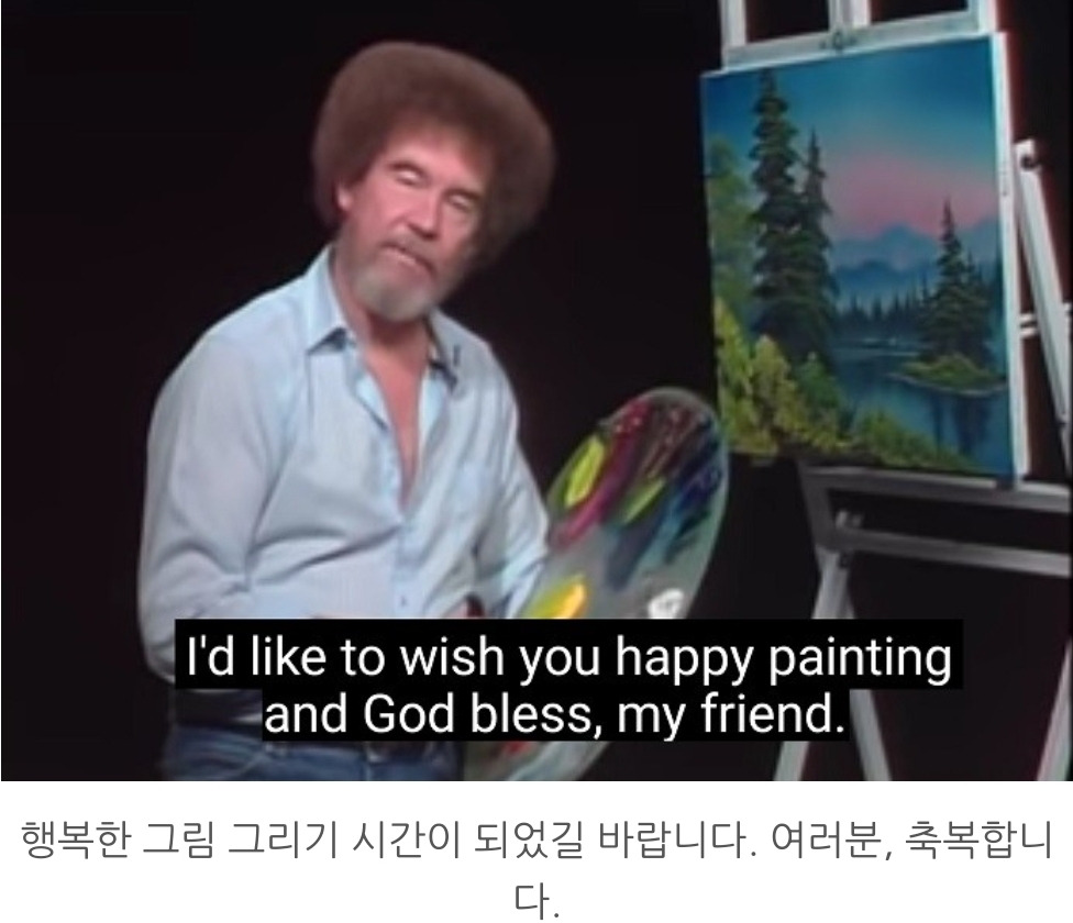 이상하게 그냥 Bob Ross라고 불러지지 않는다. 꼭 아저씨라는 말을 붙이고 싶어 진다. 공영 방송 시간이 제한적이던 시절, 정 볼 게 없을 때 틀어보던 교육 방송에 자주 등장했던 아저씨는 보는 사람의 머릿속을 순식간에 비우고 넋을 놓게 만드는 능력이 있었다. 며칠 전 잠이 안 와서 뒤척이다가 문득 아저씨가 생각났다. 강산이 변하고도 남을 시간이 흘렀고 아저씨도 돌아가셨지만 마음과 머리가 복잡해 잠이 오지 않는 밤 갑자기 떠오른 아저씨는 구원자 같았다. 지금 내게 필요한 것은 아무것도 없이 텅 빈 마음과 머리가 가져다주는 평화다.
