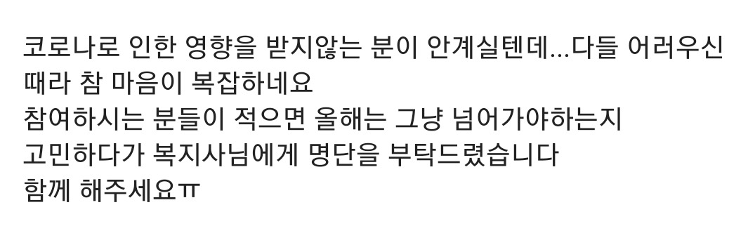 이번에도 선물을 보내기 위해 지인이 수십 명 아이들의 이름, 학년, 성별, 그리고 가지고 싶어 하는 선물의 가격과 온라인 쇼핑몰의 품목 번호를 정리해서 게시글로 올렸는데 한편으로는 마음이 복잡했나 보다. 코로나 때문에 가계가 어려운 사람들이 많을 것 같았기 때문이다. 많은 고민 끝에 선물 목록을 올리기로 한 심정을 그대로 올렸다.