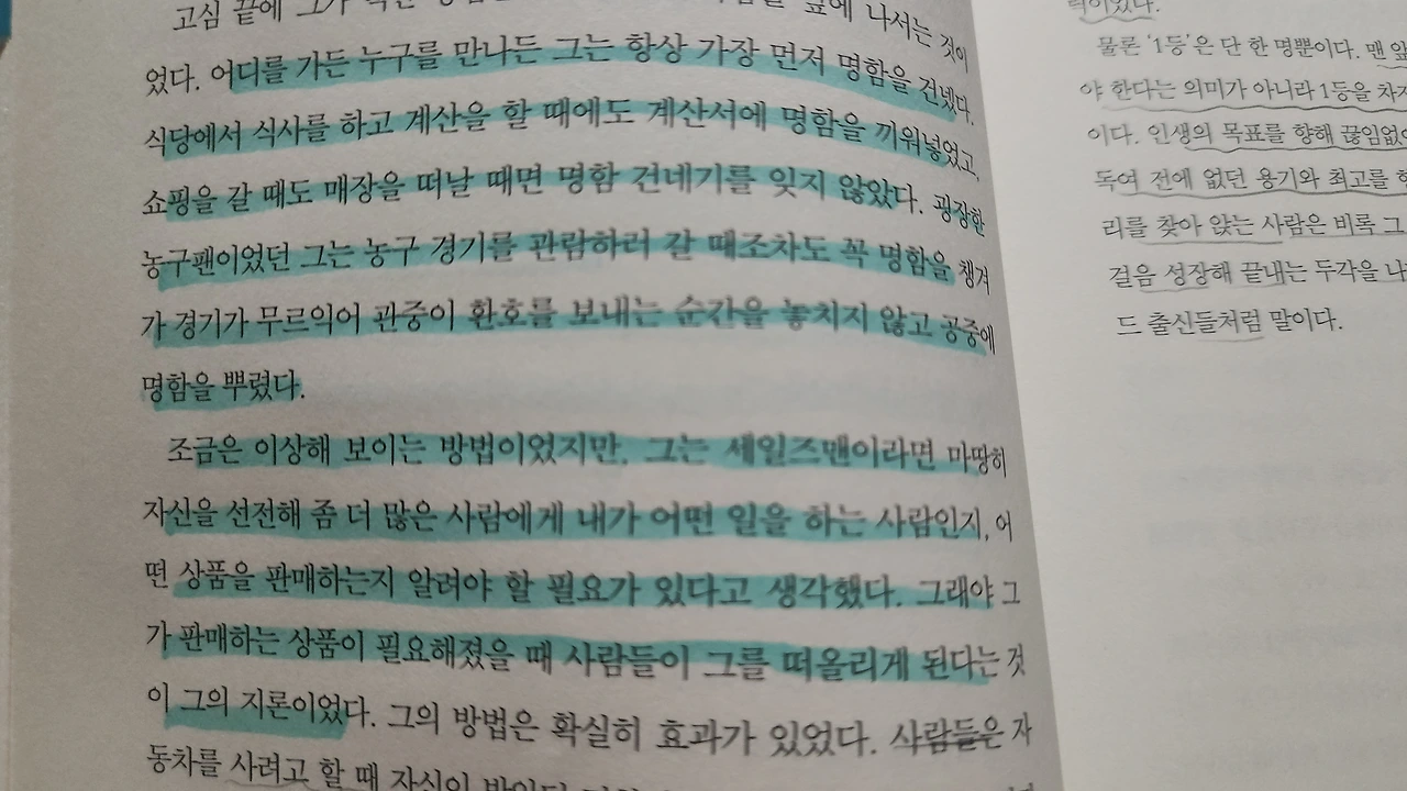 어디를 가든 누구를 만나든 그는 항상 가장 먼저 명함을 건넸다. 식당에서 식사를 하고 계산을 할 떄에도 계산서에 명함을 끼워넣었고 쇼핑을 갈 때도 매장을 떠날 때면 명함 건네기를 잊이 않았다.