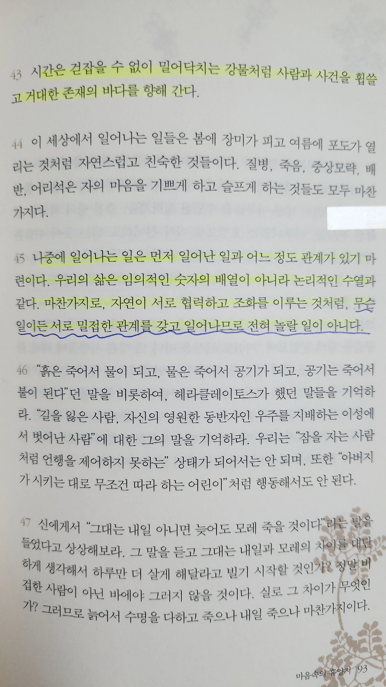 나중에 일어나는 일은 먼저 일어난 일과 어느 정도 관계가 있기 마련이다. 우리의 삶은 임의적인 숫자의 배열이 아니라 논리적인 수열과 같다. 마찬가지로, 자연이 서로 협력하고 조화를 이루는 것처럼, 무슨 일이든 서로 밀접한 관계를 갖고 일어나므로 전혀 놀랄 일이 아니다.