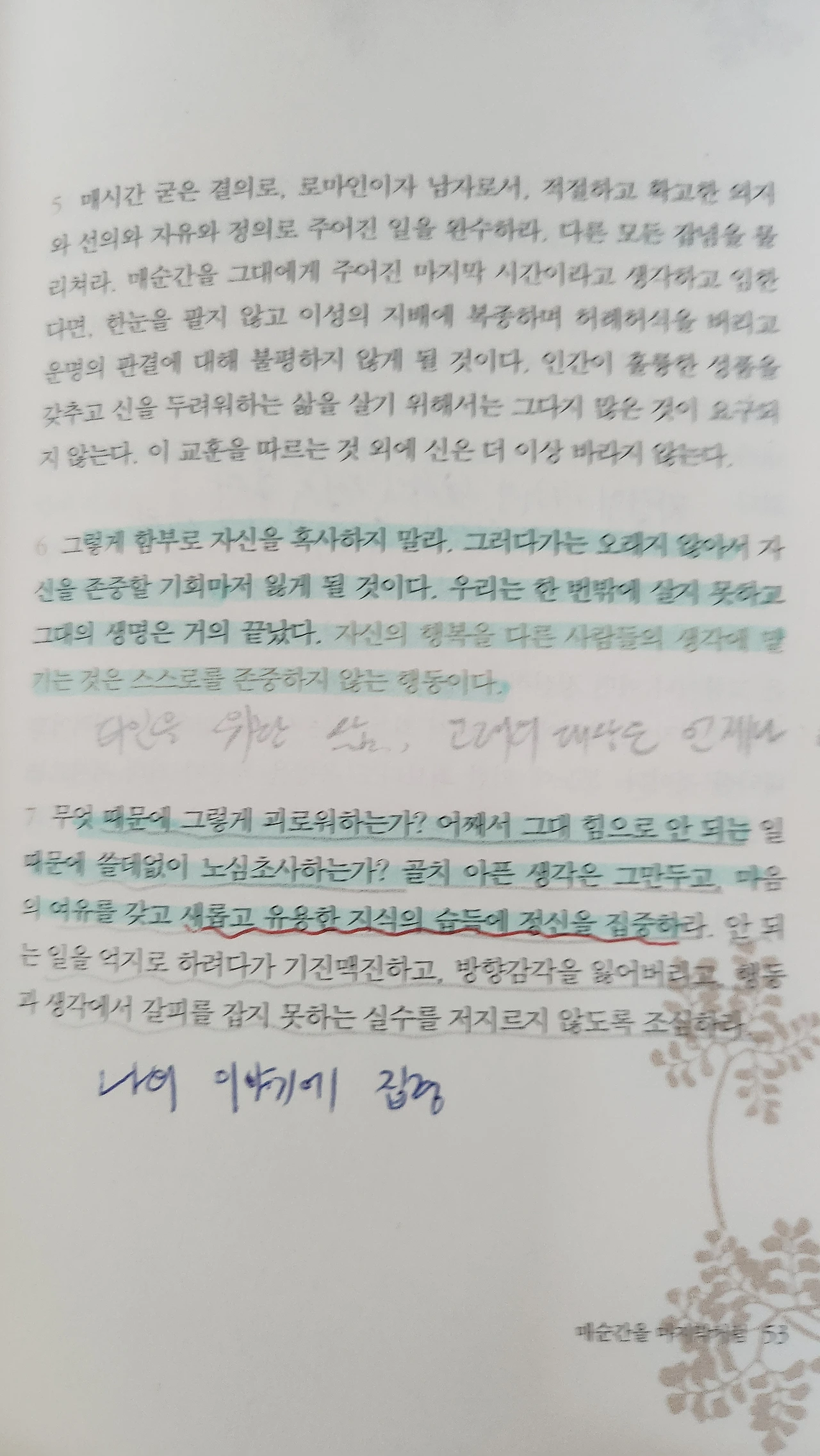 무엇 때문에 그렇게 괴로워하는가? 어째서 그대 힘으로 안 되는 일 때문에 쓸데없이 노심초사하는가? 골치 아픈 생각은 그만두고, 마음의 여유를 갖고 새롭게 유용한 지식의 습득에 정신을 집중하라.