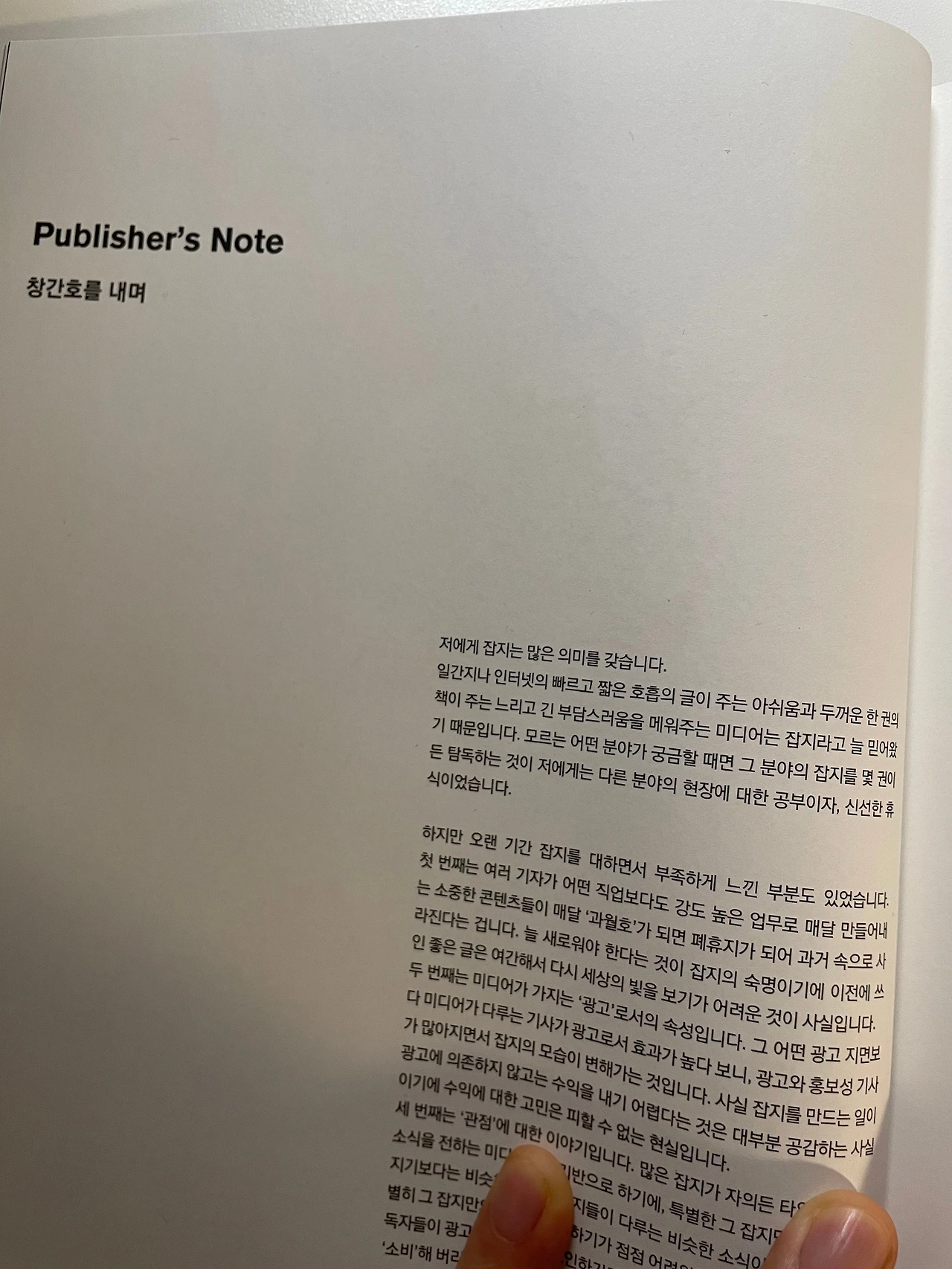 일간지나 인터넷의 빠르고 짧은 호흡의 글이 주는 아쉬움과 두꺼운 한 권의 책이 주는 느리고 긴 부담스러움을 메워주는 미디어는 잡지라고 늘 믿어왔기 때문입니다. 모르는 어떤 분야가 궁금할 때면 그 분야의 잡지를 몇 권이든 탐독하는 것이 저에게는 다른 분야의 현장에 대한 공부이자, 신선한 휴식이었습니다.