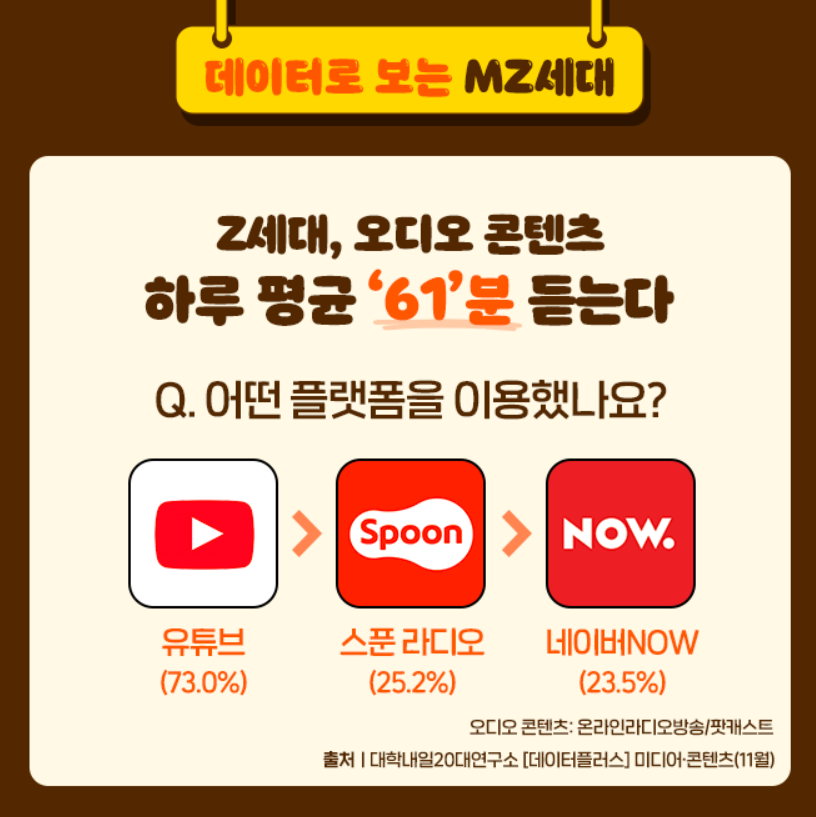 저희 밀레니얼 세대까지의 라디오는 여전히 MBC FM4U 같은 공중파 라디오였는데, 요즘은 과연 Z세대 그리고 그다음의 알파 세대에게는 라디오와 오디오 콘텐츠를 떠올렸을 때 어떤 서비스나 브랜드가 떠오를지 궁금하고 상상해보기도 합니다.