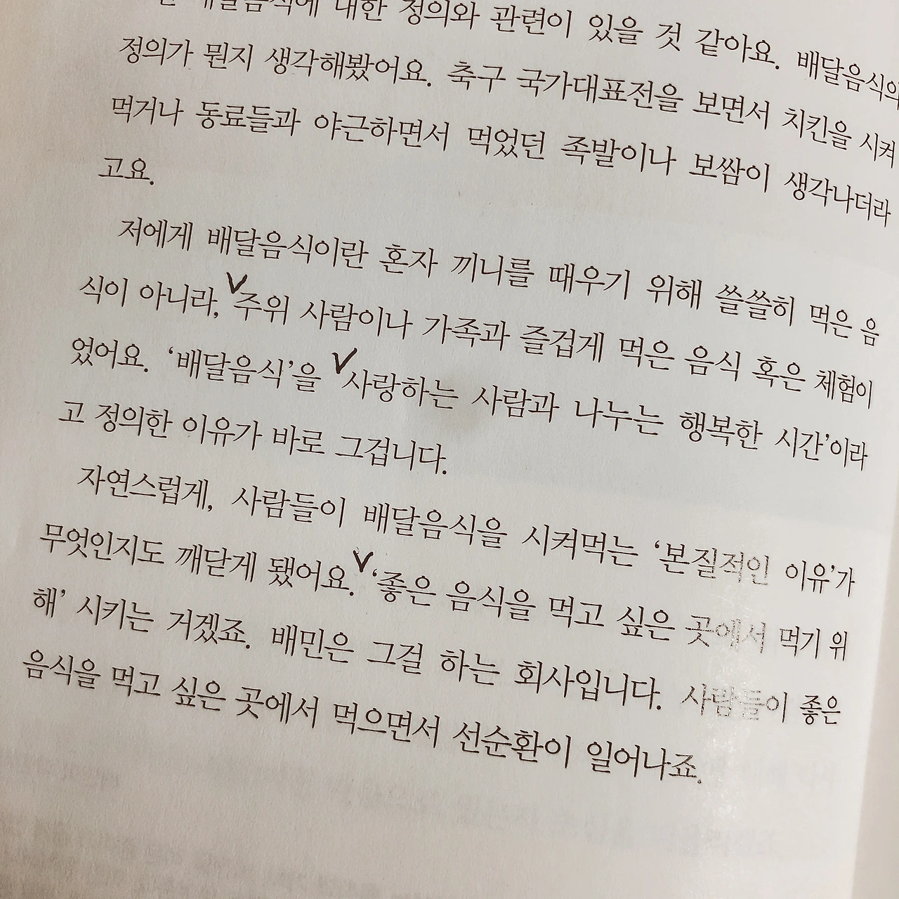 c. 옆 자리 동료가 빌려준 책을 보니 김봉진 대표님은 배달음식에 대해 이런 말씀을 하셨다.