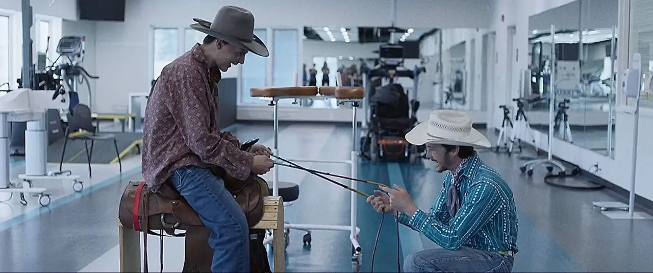브래디는 카우보이 중에 사고를 당했다. 영화는 로데오 중 느껴지는 어떠한 흥분도 없이 그 사건 이후를 다룬다. 우리가 로데오를 볼 수 있는 것은 오직 핸드폰의 작은 화면을 통해서 뿐이다. 핸드폰 속 그들은 열렬한 환호 속에 길들여지지 않은 성난 짐승에 올라타지만, 정작 그 좁은 액정을 보는 그들의 현재는 말에 올라타는 것조차 버겁다. 무력한 현재의 시간에서 로데오를 대신하는 것은 말타기를 흉내 내는 몸짓이다. 브래디는 친구에게 로데오를 가르쳐주면서 말 모형에 앉아 힘차게 발을 내 뻗는다. 그리고 레인의 재활 치료에 찾아가 카우보이 옷을 입히고 떨리는 손으로 줄을 겨우 잡게 한 채 당기도록 한다.