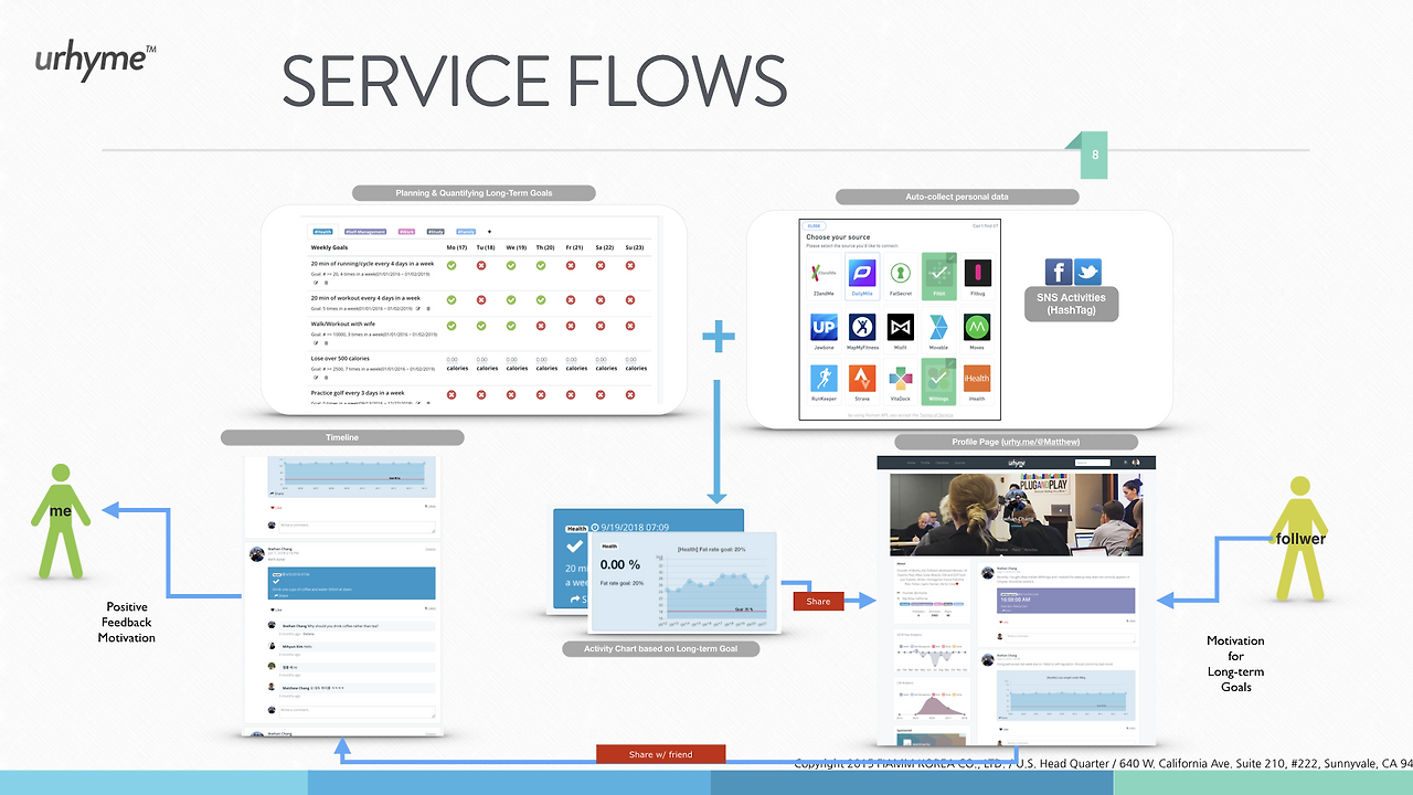 결국, 유라임은 동기부여와 자기관리에 초점을 맞춘 SNS의 순기능을 이용한 시스템이다. 내 프로필에는 내가 모아둔 데이터와 이에 대한 차트가 있고, 공개된 데이터에 한해서 누구나 이를 확인할 수 있다. 내가 '성취'라고 생각하는 것에 대해서는/혹은 피드백을 받고 싶은 데이터에 대해서는 차트를 내 타임라인 혹은 페이스북 등에 공유할 수 있는 시스템이다. (물론, 철저히 본인만 사용할 수도 있다.)