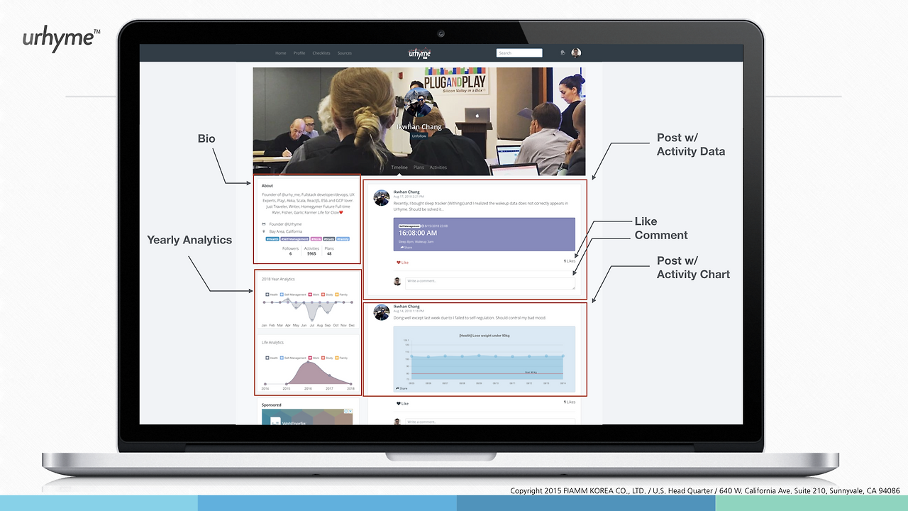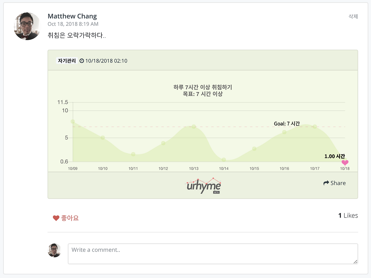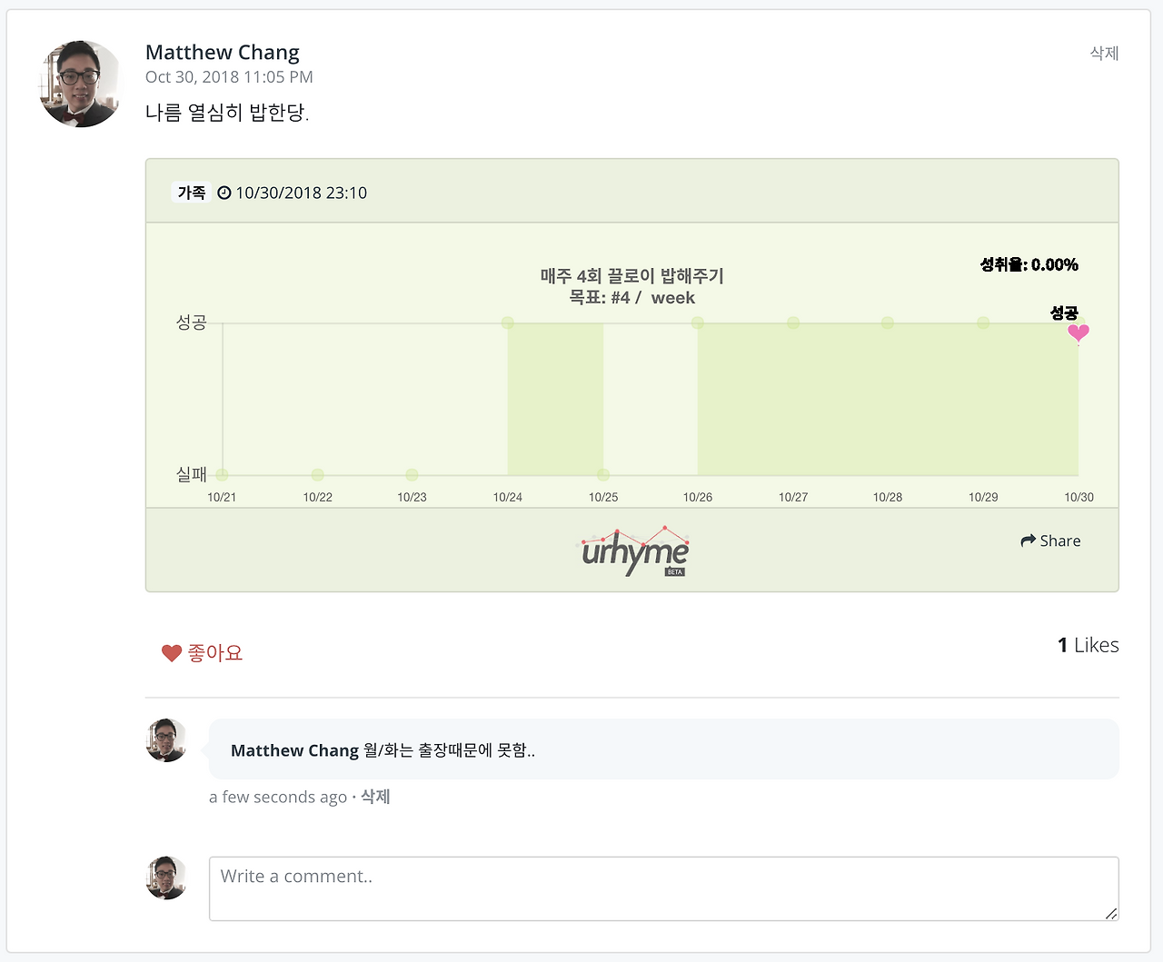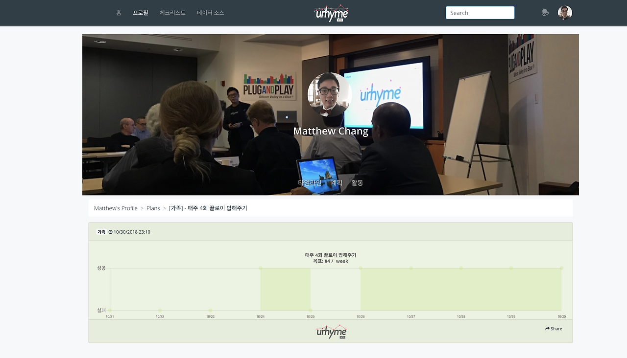 쉽게 짐작이 가능하겠지만, 프로필은 말 그대로 프로필이다. 위에서 언급한것과 같이, 모든 유저들은 고유의 프로필 주소를 가질 수 있으며 (필자의 프로필 주소는 https://www.urhy.me/@matthew.chang 이다. 확인가능하다.) 여기는 내 기본 프로필, 연간/월간 분야별 차트, 그리고 내가 공유한 데이터가 들어가게 된다. 쉽게 말하면, 페이스북의 그것과 같지만 내 프로필을 만들어 가는 주체가 되는 것은, 내 목표에 대한 활동이 기본이 되는 것이다.