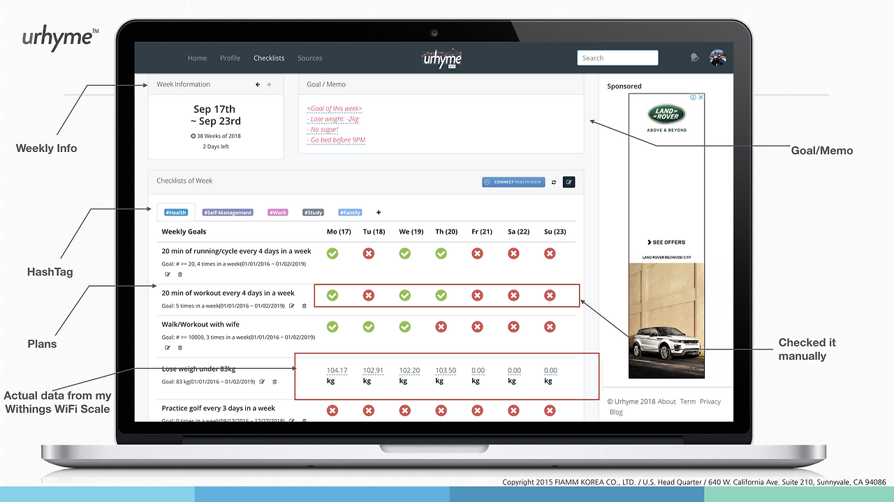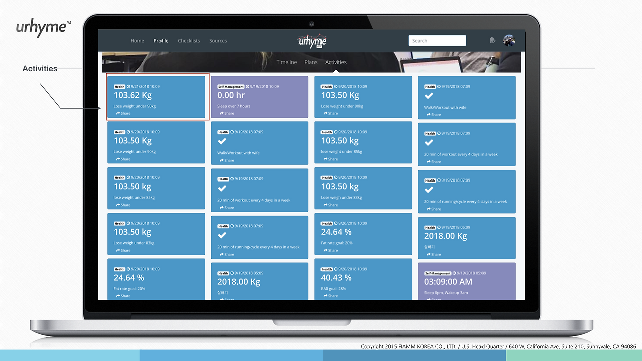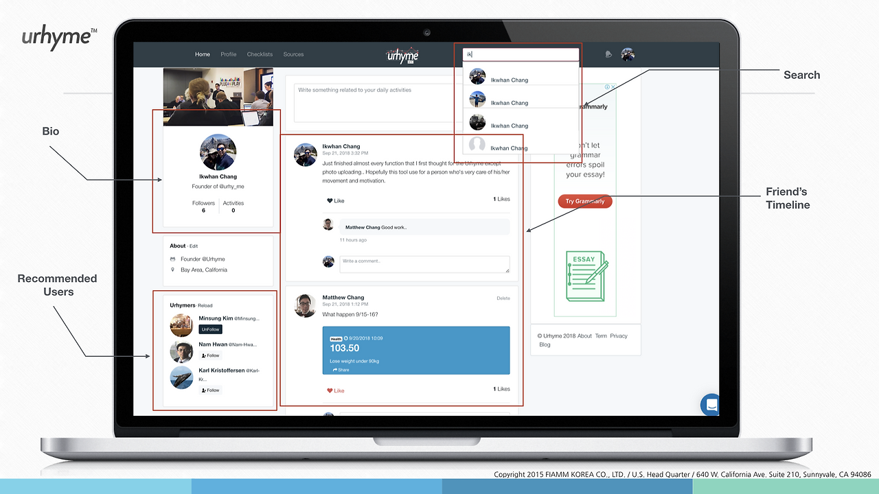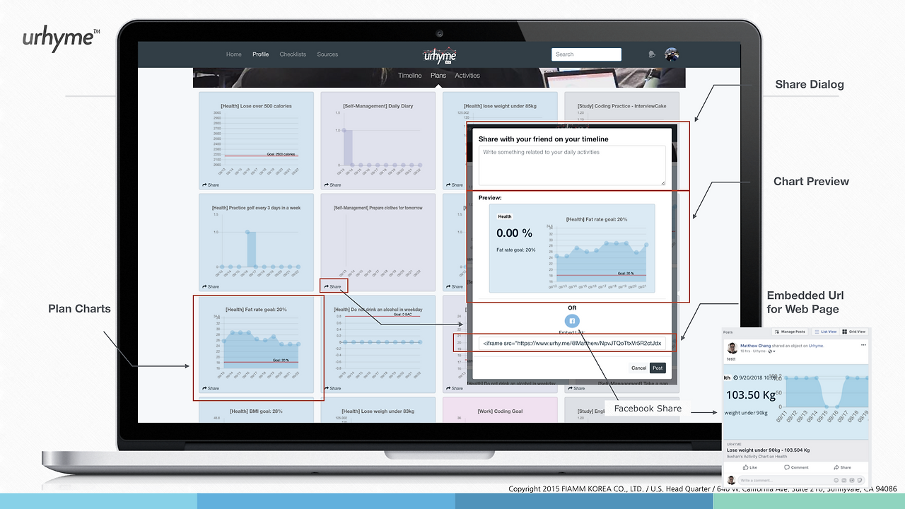 쉽게 짐작이 가능하겠지만, 프로필은 말 그대로 프로필이다. 위에서 언급한것과 같이, 모든 유저들은 고유의 프로필 주소를 가질 수 있으며 (필자의 프로필 주소는 https://www.urhy.me/@matthew.chang 이다. 확인가능하다.) 여기는 내 기본 프로필, 연간/월간 분야별 차트, 그리고 내가 공유한 데이터가 들어가게 된다. 쉽게 말하면, 페이스북의 그것과 같지만 내 프로필을 만들어 가는 주체가 되는 것은, 내 목표에 대한 활동이 기본이 되는 것이다.