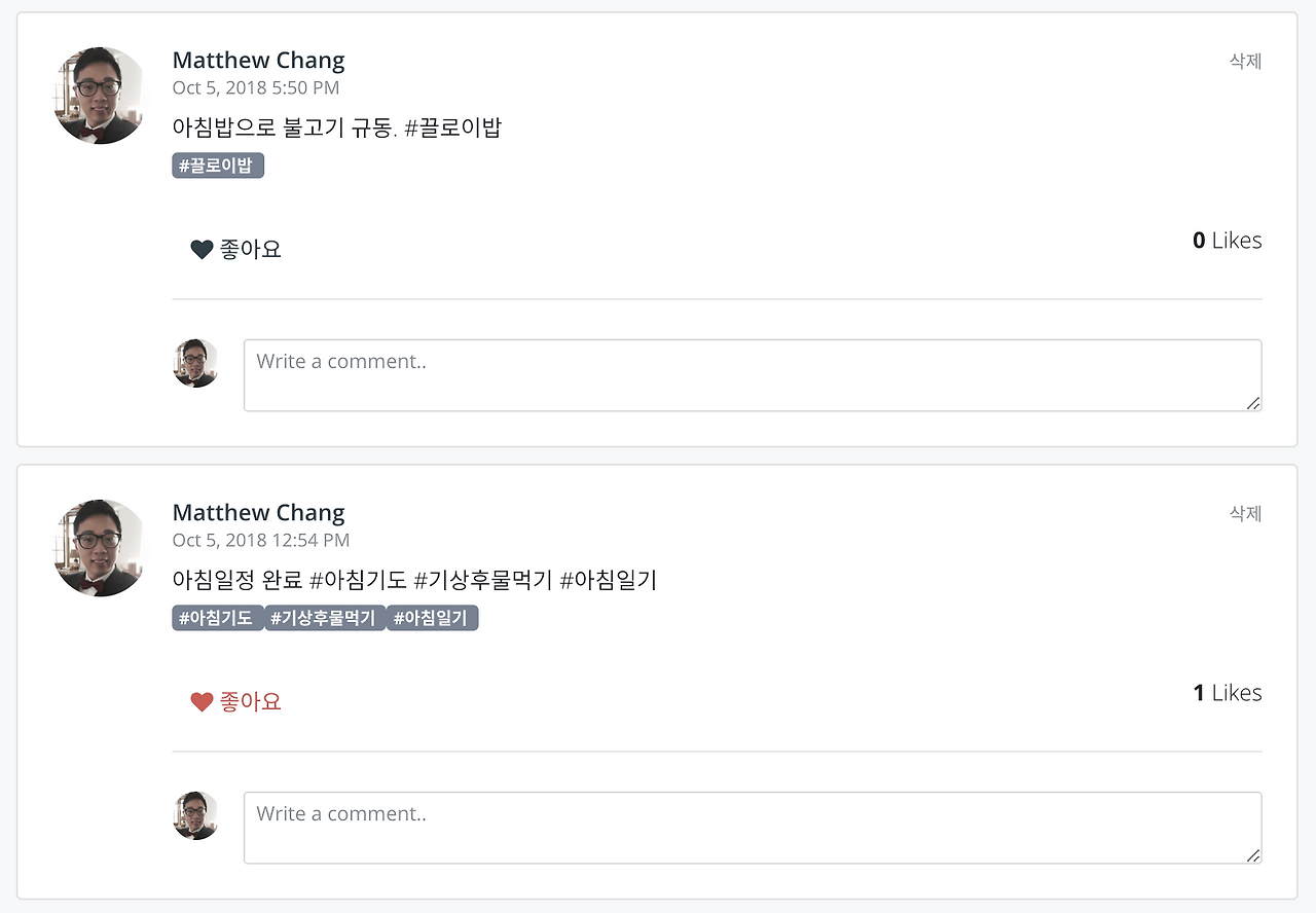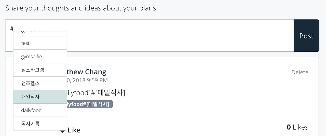 그렇게 목표를 설정하면, 데이터 소스가 있는 경우에는 자동으로 데이터가 모아지게 될 것이고, 데이터 소스가 없는 경우에는 본인이 수기로 체크하거나 (아마 귀찮아서 많이들 안할듯 하다.) 해시태그로 위와 같이 타임라인에 글쓰면 된다. 데이터 수집에 대해서는 지금도 방법을 계속 생각중에 있다.