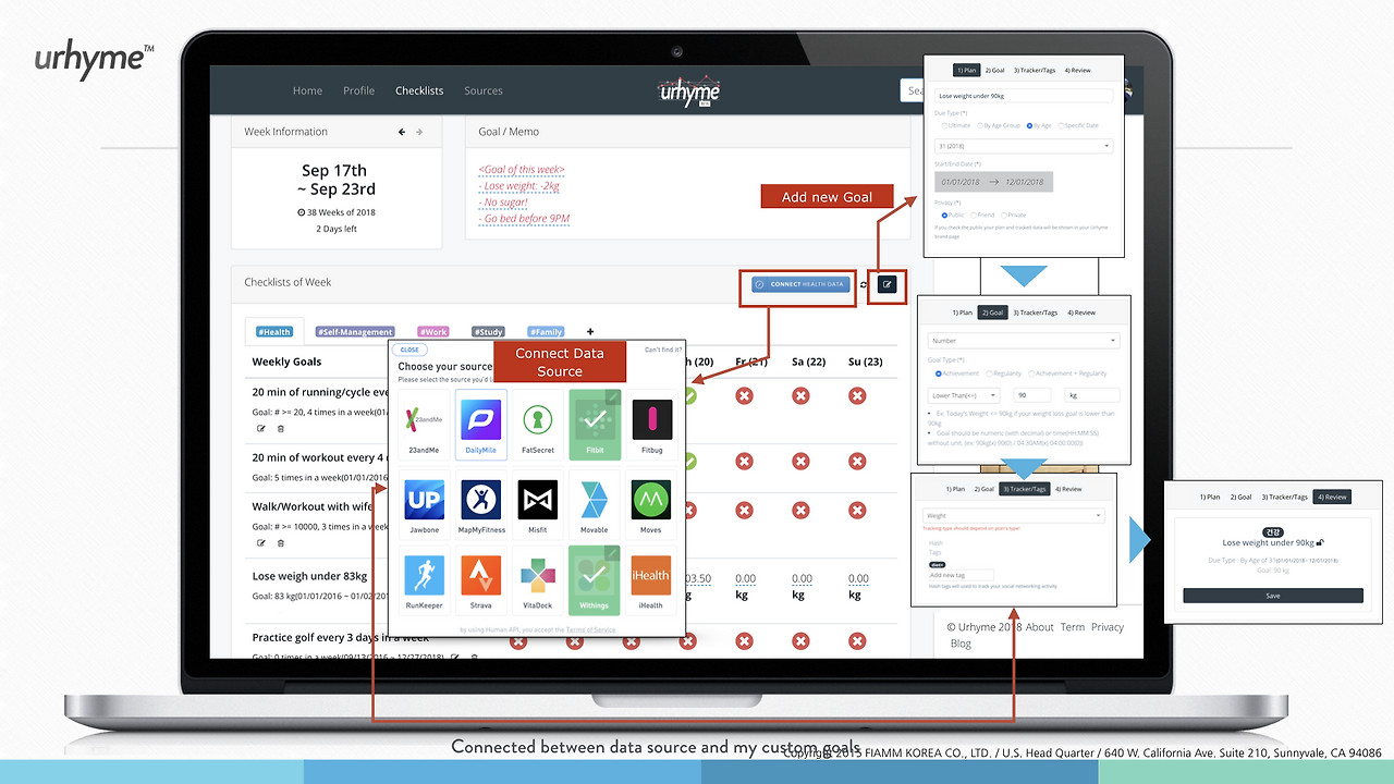 그리고 마지막으로 데이터 Source를 설정하게 된다. 현재는 헬스케어 데이터에 대해서만 Fitbit, Withings(Nokia), RunKeeper 등 위에 있는 벤더만 가능하지만, 계속해서 추가중이다. 예컨데 최근 추가중인 Wakatime (wakatime.com)의 경우에는 코딩시간을 측정해주고, 유명한 데스크탑 트래킹 툴인 RescueTime에서는 생산성에 대한 트래킹을 제공한다. 아니면 BACTracker라는 음주측정 IoT장비가 있는데, 이것도 현재 연동을 어떻게 할지 고민중이다. (아마 이게 된다면, 음주 목표를 설정해두고 측정해서 목표로 설정할 수 있을것이다.)