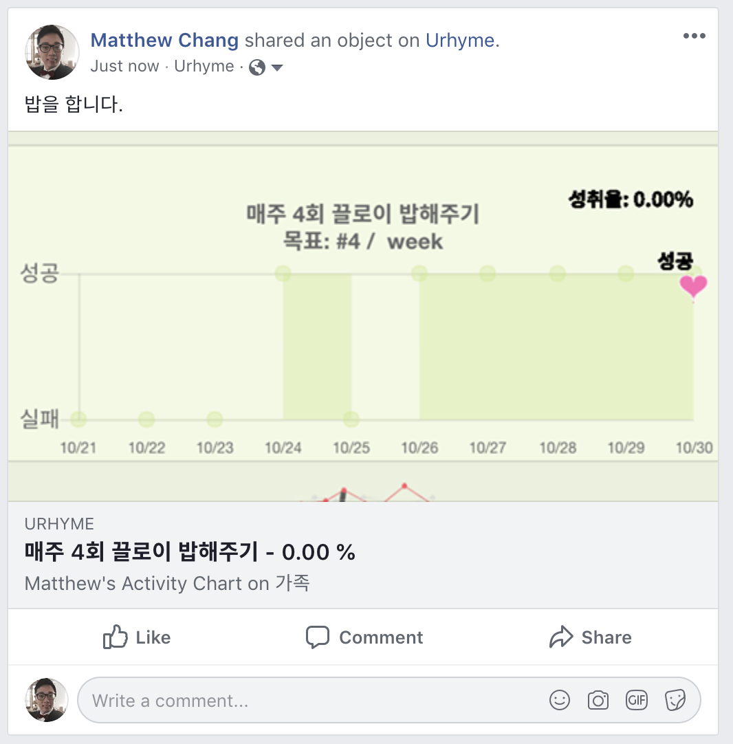 위와 같이 본인의 유라임 타임라인에 공유하면 된다. 물론 오른쪽 처럼 페이스북에 직접 공유할 수도 있다. 위 등록된 글의 URL은 https://www.urhy.me/@matthew.chang/WRXVNvV-HoXCmcBh7Fm3GaeORkKBqEXlQpdvVhX7EeE&mode=share 인데, 애석하게도 서버사이드 랜더링이 안되서 브런치에서는 공유가 안된다. 뭐 수정해야지... (링크는 아래처럼 나온다.) 그래도 아래와 같이 실제 링크는 잘 작동한다.