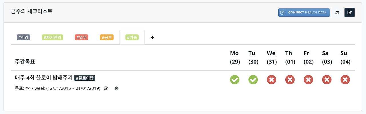 나에게는 건강, 자기관리, 업무, 공부, 가족 에 대한 삶에 대한 분류가 있고, 위와 같이 등록된 목표에 연계된 해시태그가 있다. 그럼 나는 이번 월요일과 화요일에 저녁 요리를 했으므로, 단순히 체킹을 통해 데이터를 수집한다.