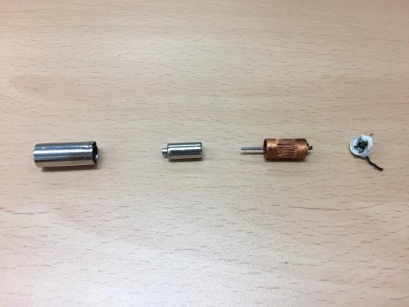 수명이 다한 브러시드 모터르 분해해 보면 재미있게도 자석이 안쪽에 코일이 바깥쪽에 있습니다. 브러시드 모터지만 더 높은 토크를 위해 아웃 러너 모터 구조를 가지고 있습니다.