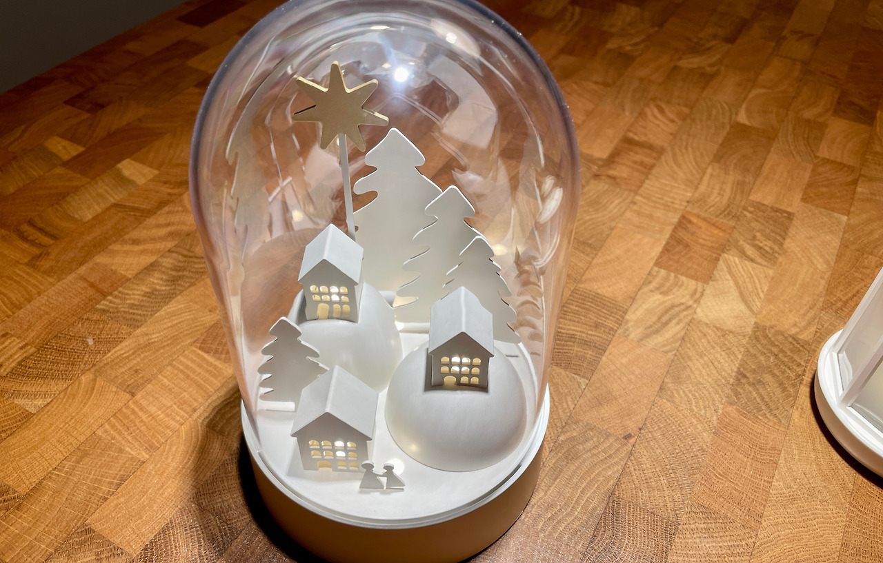 이 스노볼 같은 장식은 노골적이지 않은 크리스마스 상징으로 이루어져 있습니다. 커다란 전나무와 눈 덮인 마을입니다. 하지만 투명한 원형 돔은 이 장난감은 크리스마스 전용이다 강하게 표현하고 있습니다. 티끌 하나 없이 깨끗하지만 놀랍게도 플라스틱입니다.