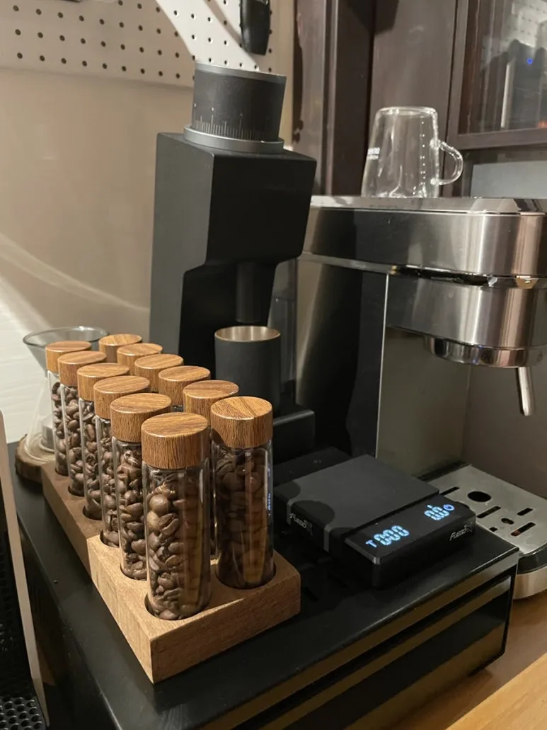 큰 병에 커피를 넣으면 아무리 밀봉을 잘해도 소분할 때마다 커피 향미가 날아가겠더라고요. 지금은 저렇게 12병에 소분하고 나머지는 밀봉 용기에 넣어 냉장고에 보관합니다. 1달 이내라면 마지막까지 맛이 크게 변하지 않아서 이후 계속 이렇게 보관하고 있습니다.