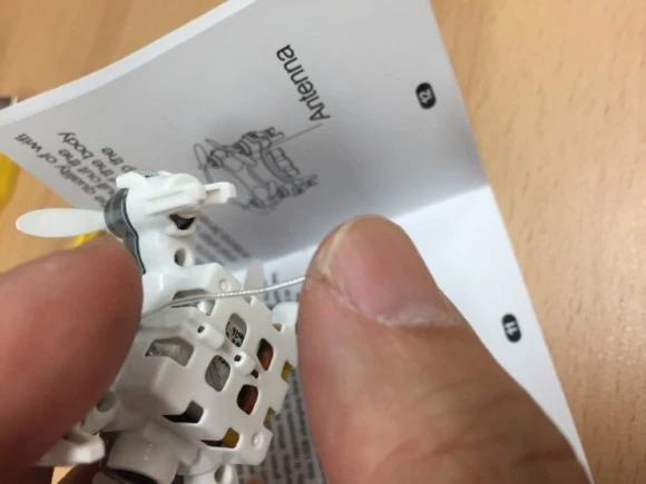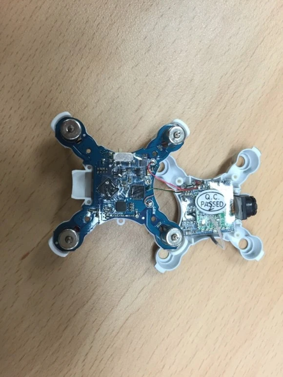 사자마자 분해를 해보면 카메라를 포함한 영상 송신 모듈과 아래쪽에 FC와 ESC 일체형 보드를 볼 수 있습니다. 배터리를 가로 질려 안테나가 하나 더 있는 것을 보면 영상과 조종 각각 다른 안테나를 사용하는 듯합니다.